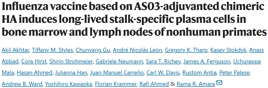 基于AS03佐剂的嵌合血凝素流感疫苗可诱导非人灵长类动物骨髓及淋巴结中的长效茎部特异性浆细胞