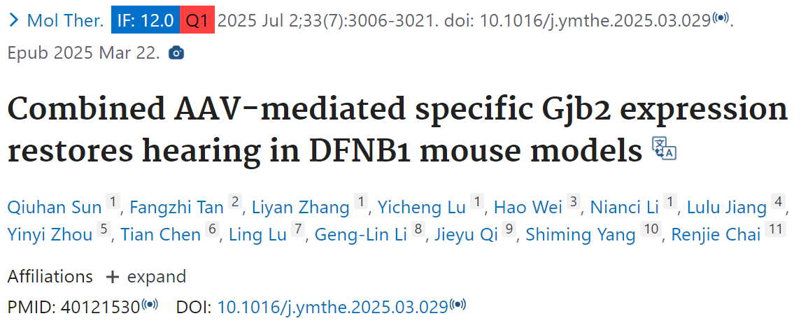 英文题目:Combined AAV-mediated specific Gjb2 expression restores hearing in DFNB1 mouse models