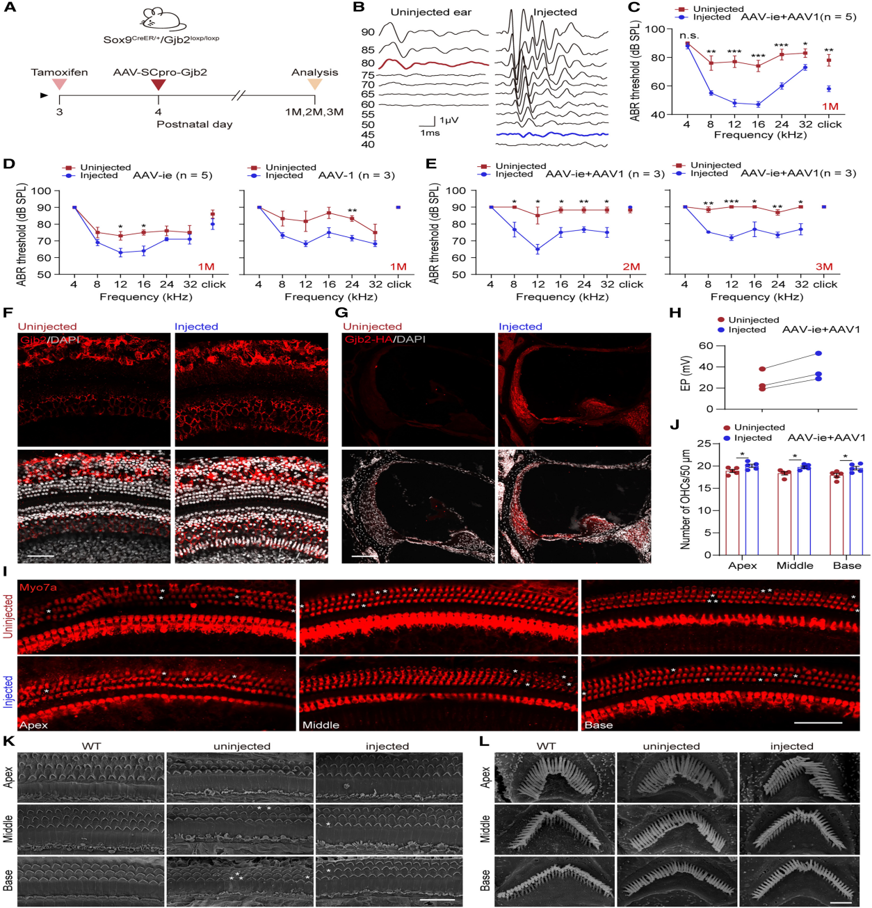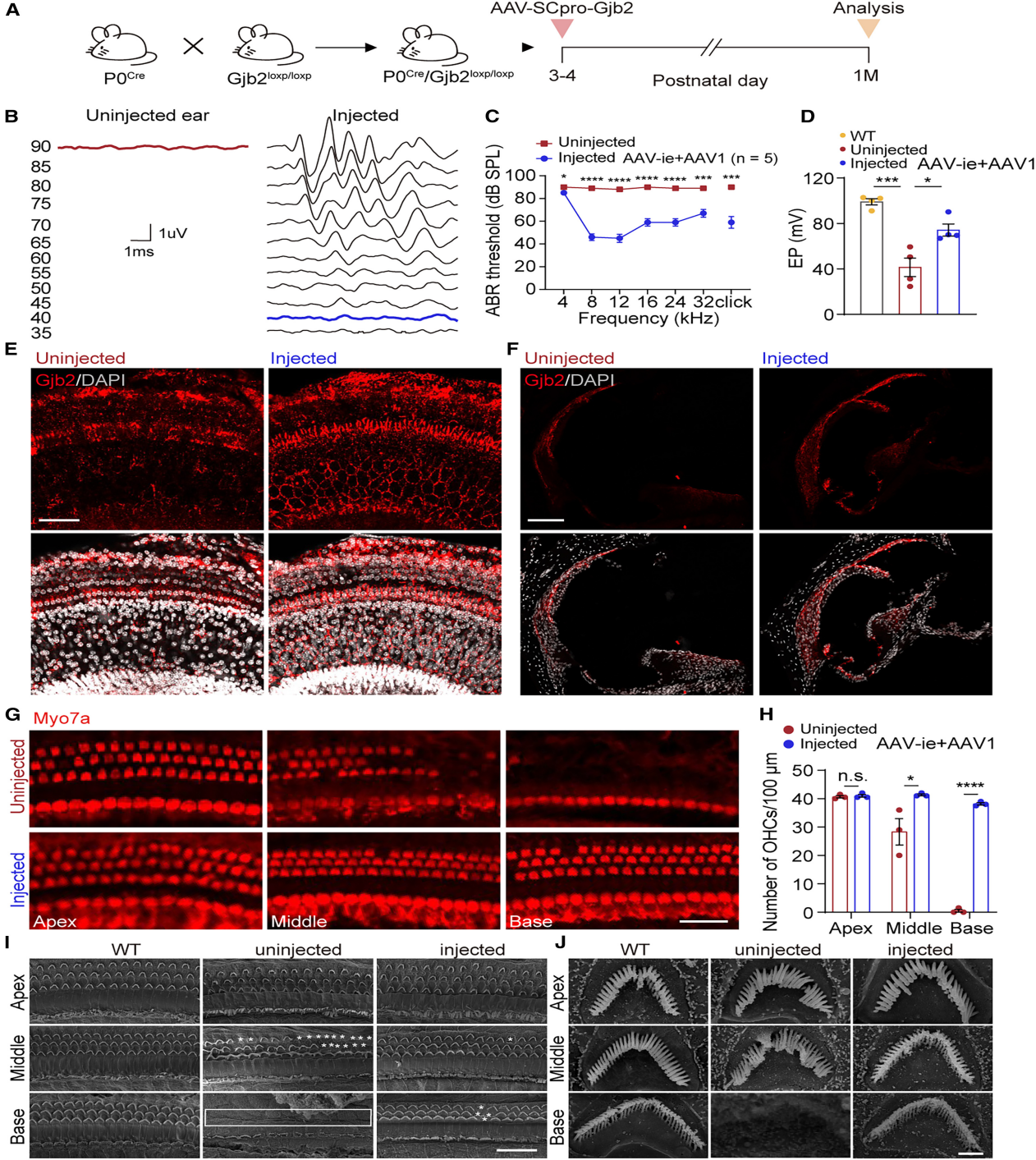 免疫荧光分析显示,与未注射的耳朵相比,注射耳朵的OC和LW区域的Gjb2表达显著恢复。此外,EP测试显示注射耳蜗中的EP显著改善。OHC计数和扫描电子显微镜(SEM)显示,Gjb2的重新表达减轻了HC丢失,并可能预防注射耳蜗中回合底回处的HC静纤毛紊乱。