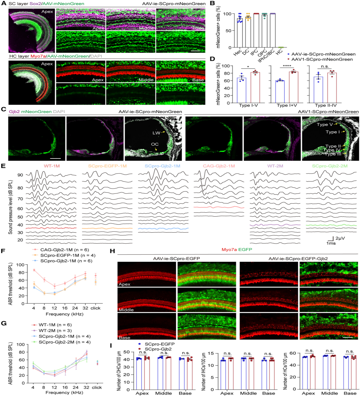 研究团队之前构建了一种耳蜗特异性启动子SCpro(中国专利号 202310650073.4)。为了评估SCpro在整个耳蜗中的表达范围,研究者在SCpro的控制下将携带mNeonGreen的AAV-ie载体注射到WT新生小鼠的耳蜗中。携带SCpro的AAV在SC中实现了较高的转导效率。重要的是,在HCs中未观察到mNeonGreen表达,从而证明了耳蜗内SCpro活性的特异性。鉴于Gjb2在LW中的高表达,团队还评估了SCpro在耳蜗LW组织中的活性。携带SCpro的AAV-ie和AAV1血清型均诱导LW细胞中的mNeonGreen表达。值得注意的是,与AAV-ie相比,携带SCpro的AAV1表现出更好的转导效率,这与对携带CAG启动子的 AAV 的观察结果一致。