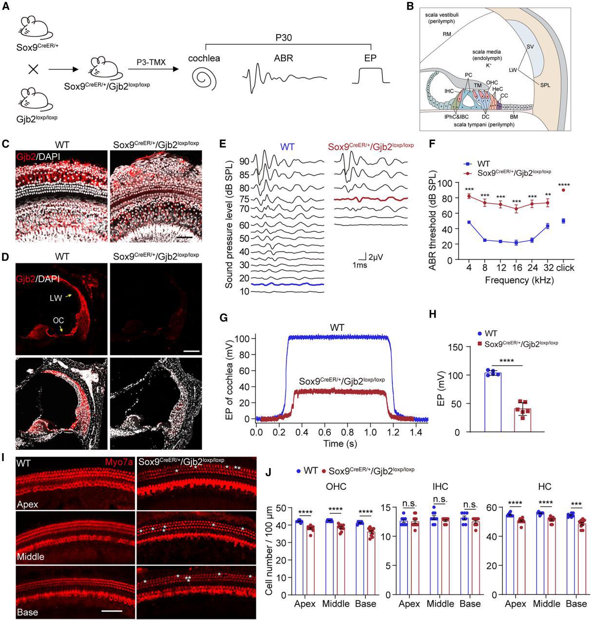 超过50%的新生儿先天性耳聋由遗传缺陷引发,其中非综合征型占比最高,而Gjb2基因是首个被证实与该类型耳聋相关的致病基因。其不同突变可导致常染色体隐性遗传性耳聋1(DFNB1),通过影响连接蛋白26(Cx26)功能引发程度不一的先天性听力损失。Cx26在耳蜗支持细胞、血管纹等组织表达,通过与Cx30形成上皮及结缔组织间隙连接网络,维持内耳高K离子平衡及毛细胞机械转导电流,对耳蜗生理功能至关重要。