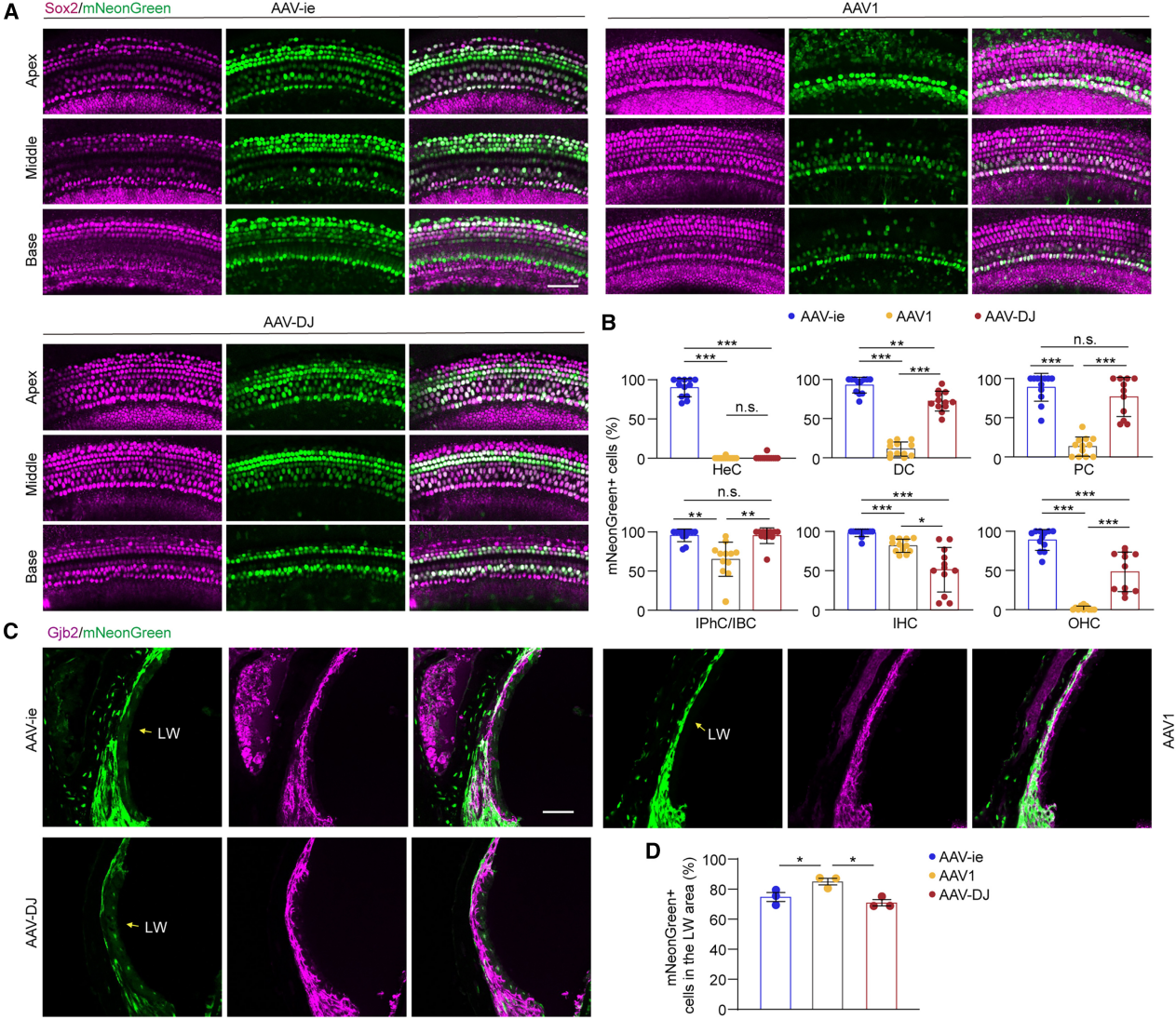 实验采用等剂量携带绿色荧光蛋白mNeonGreen的AAV1、AAV-DJ和AAV-ie,通过圆窗膜注射至野生型P1小鼠耳蜗,并于P7收获耳蜗以评估荧光分布及转导效率。结果显示:AAV-ie在支持细胞(包括Deiters细胞、柱细胞及内指骨细胞/内边界细胞)中具有约 90% 的转导效率;AAV-DJ对支持细胞的转导效率为70%-90%;而AAV1在IPhCs/IBCs中的转导效率约为65%,但在其他类型内耳支持细胞中仅为约8.5%。耳蜗冰冻切片分析进一步表明,AAV-ie、AAV1和AAV-DJ在外侧壁(LW)中的转导效率均约为 75%。上述结果表明,AAV-ie与AAV1联合应用可高效靶向耳蜗感觉上皮支持细胞及外侧壁区域的细胞。