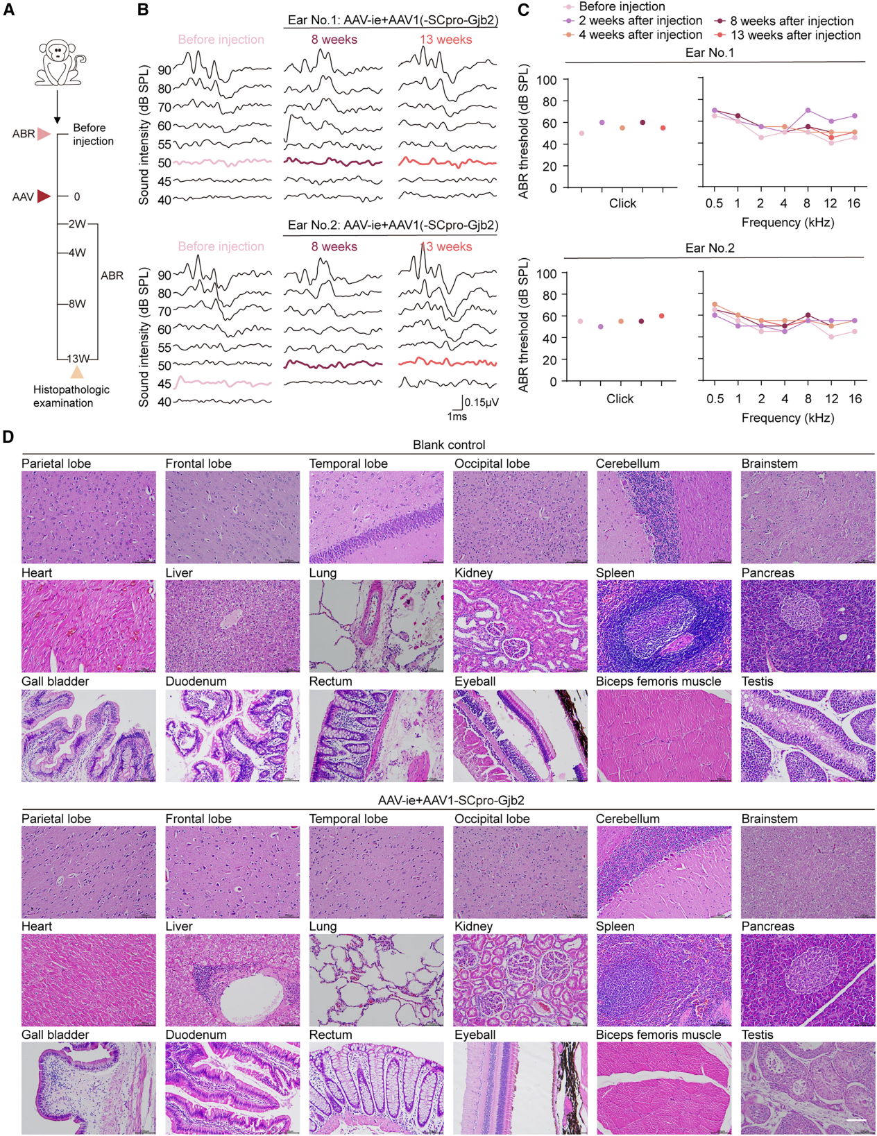 图7. Gjb2过表达不会诱导食蟹猴的听力损失或组织病变