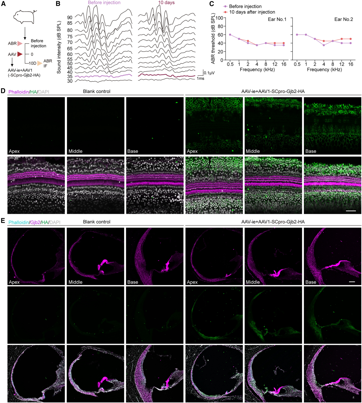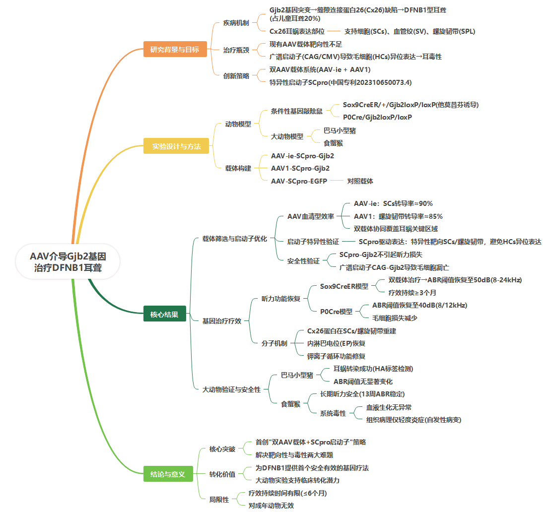 本研究开发了联合AAV策略:利用AAV-ie高效转导耳蜗柯蒂氏器(OC)以及AAV1靶向耳蜗外侧壁(LW)的特点,结合特异性启动子SCpro限制Gjb2表达,避免异位毒性。实验显示,该策略成功恢复了两种Gjb2缺陷小鼠模型的Gjb2表达及听觉功能。研究者进一步在大型动物(Bama微型猪、食蟹猴)中验证了转导效率、评估了安全性。本研究为AAV-Gjb2基因疗法的临床转化奠定了关键基础。