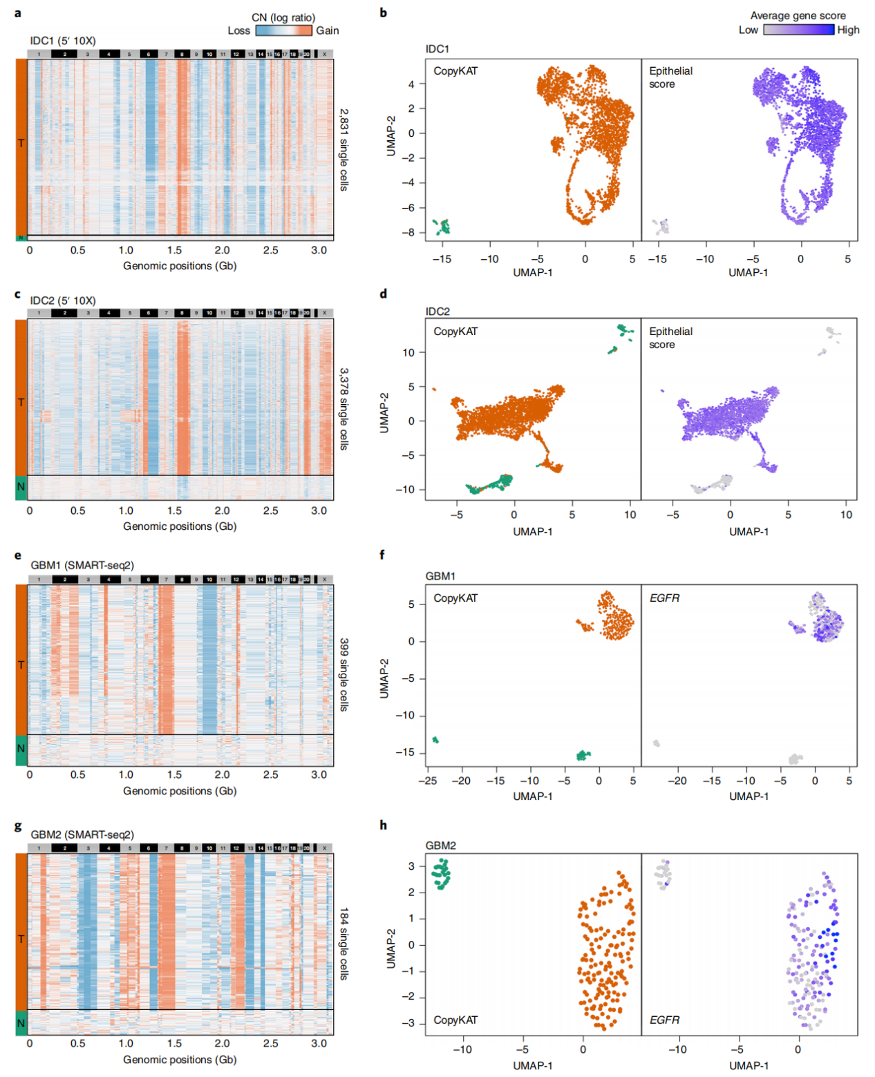 在验证了 CopyKAT 对 3′scRNA-seq 数据的适用性后,研究进一步探讨了该方法在第一代 scRNA-seq 数据(SMART-seq2)以及 5′scRNA-seq 数据(10X Genomics)中应用的可行性。该研究对两例雌激素受体阳性浸润性导管癌(ER+ IDC)肿瘤(IDC1、IDC2)进行了 5′ scRNA-seq 测序,同时分析了先前研究中两例多形性胶质母细胞瘤(GBM;GBM1、GBM2)的 SMART-seq2 数据。在 IDC1 和 IDC2 中,共测序 7,780 个单细胞(5′scRNA-seq,10X Genomics)。CopyKAT分析在每例肿瘤中识别出两个簇,分别代表正常细胞(N)和肿瘤细胞(T),两例肿瘤均表现出染色体8p(MYC)的大幅扩增(图4a,c)。对scRNA-seq 表达数据进行聚类分析显示,两例肿瘤中推断的非整倍体肿瘤细胞与高上皮评分的簇高度共定位(图4b,d),验证了 CopyKAT 预测的准确性。与 TNBC 样本类似,两例 ER+ IDC 肿瘤的肿瘤细胞比例均较高(分别为 97% 和 87%)。