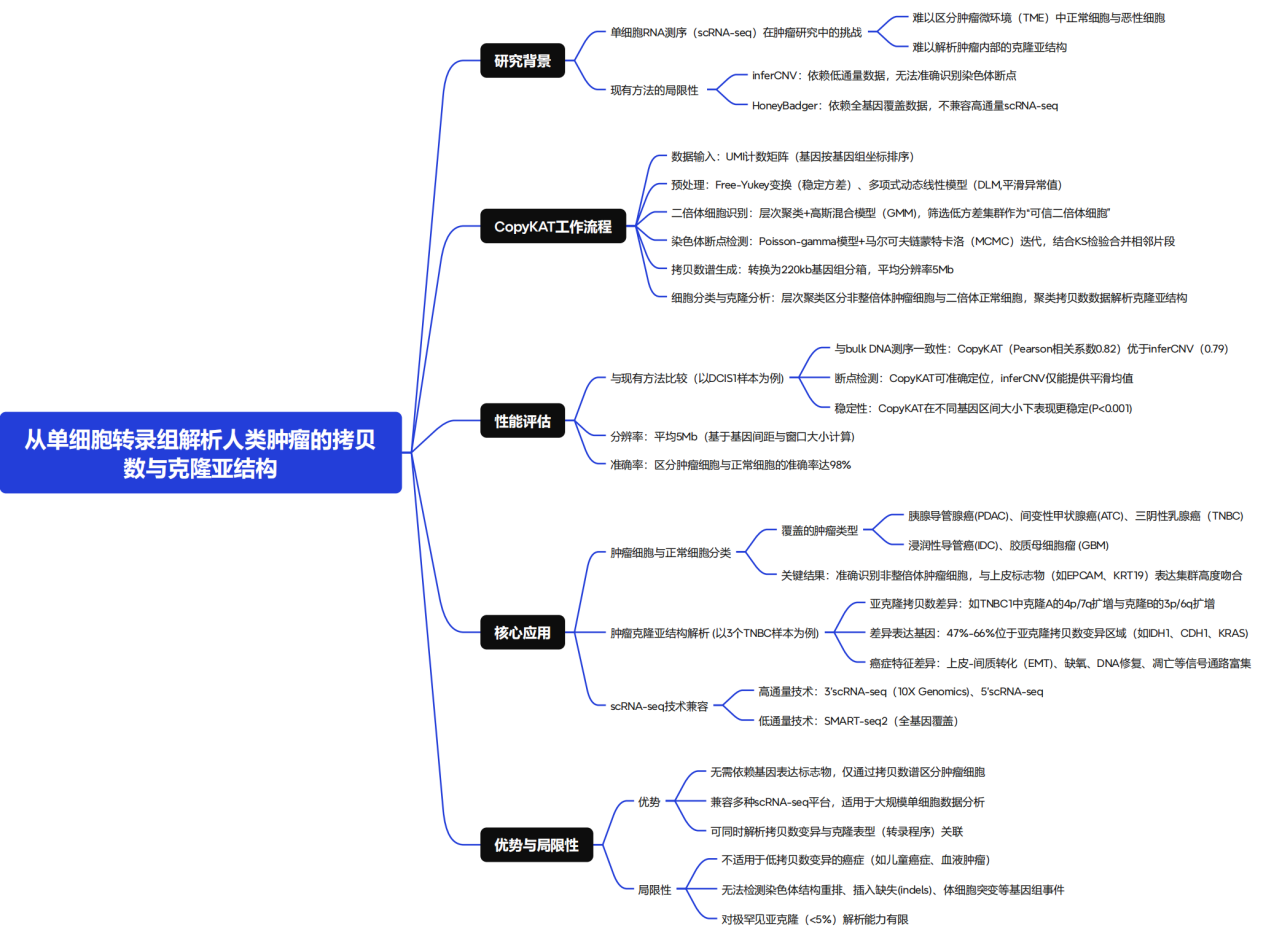 单细胞转录组分析已成为研究人类肿瘤的重要工具。然而,如何在肿瘤微环境中准确区分正常细胞与恶性细胞,以及解析肿瘤内部的克隆亚结构,仍然是重大挑战。为解决这一问题,该研究开发了一种基于整合贝叶斯分割的分析方法——非整倍体肿瘤拷贝数核型分析(CopyKAT)。该方法利用高通量单细胞RNA测序(scRNA-seq)数据的测序深度,以约5 Mb的平均分辨率推断基因组拷贝数谱。研究将CopyKAT应用于21例肿瘤(共 46,501 个单细胞)的单细胞数据分析,包括三阴性乳腺癌、胰腺导管腺癌、间变性甲状腺癌、浸润性导管癌和胶质母细胞瘤。该方法能够以高达98%的准确率区分癌细胞与正常细胞。在三例乳腺肿瘤中,CopyKAT进一步解析了具有不同癌基因(如 KRAS)表达和功能特征的克隆亚群,这些特征包括上皮-间质转化、DNA 修复、细胞凋亡和缺氧应答等。综上,CopyKAT为多种实体瘤的scRNA-seq数据解析提供了有力工具。