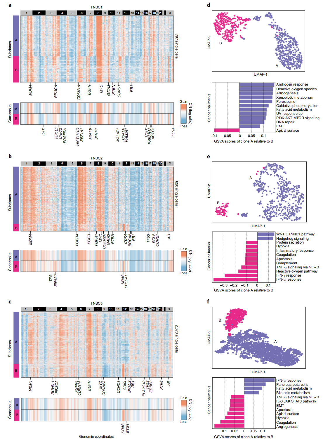在一例 TNBC 样本(TNBC1)中,对797个单细胞非整倍体拷贝数谱进行聚类分析,识别出两个主要亚克隆(A、B),分别占肿瘤总量的 44% 和 28%(图5a,上方)。聚类热图显示所有肿瘤细胞共有的克隆性扩增(1q、6p、8q、10p、16p 和 18p)及克隆性缺失(1p、4q、5q、8p、10q、13 和 14)。这些基因组区域涵盖了TCGA数据库中记录的多个已知乳腺癌相关基因,如MDM4、PIK3CA、EGFR、MYC、GATA3、PTEN、CCND1、RB1等(图5a,上方)。共识拷贝数谱的聚类热图揭示了亚克隆 CNA 事件,包括亚克隆 A 的扩增(4p、7q、9p13.2–q22.2 和 17q)以及亚克隆 B 的扩增(3p26.3–p25.1、6q、7p、11q、Xp11.23 和 Xq),这些扩增在肿瘤中存在变异(图5a,下方)。差异表达分析(DE)共鉴定出两个亚克隆间329个差异基因(FDR调整P值 < 0.01,|log2(倍数变化)| ≥ 0.5),其中 47% 位于亚克隆 CNA 区域,包括已知癌基因,如位于 2q 染色体的 IDH1 在亚克隆 A 中过表达,以及位于 16q 的 CDH1 在亚克隆 B 中过表达(图5a,下方)。这两个非整倍体亚克隆在高维空间中对应不同的表达簇(图5d,上方)。单细胞基因集变异分析(GSVA)显示,亚克隆 A 相对于亚克隆 B 富集了若干癌症标志性通路,包括雄激素反应、上皮-间质转化(EMT)及其他癌症相关通路(图5d,下方)。