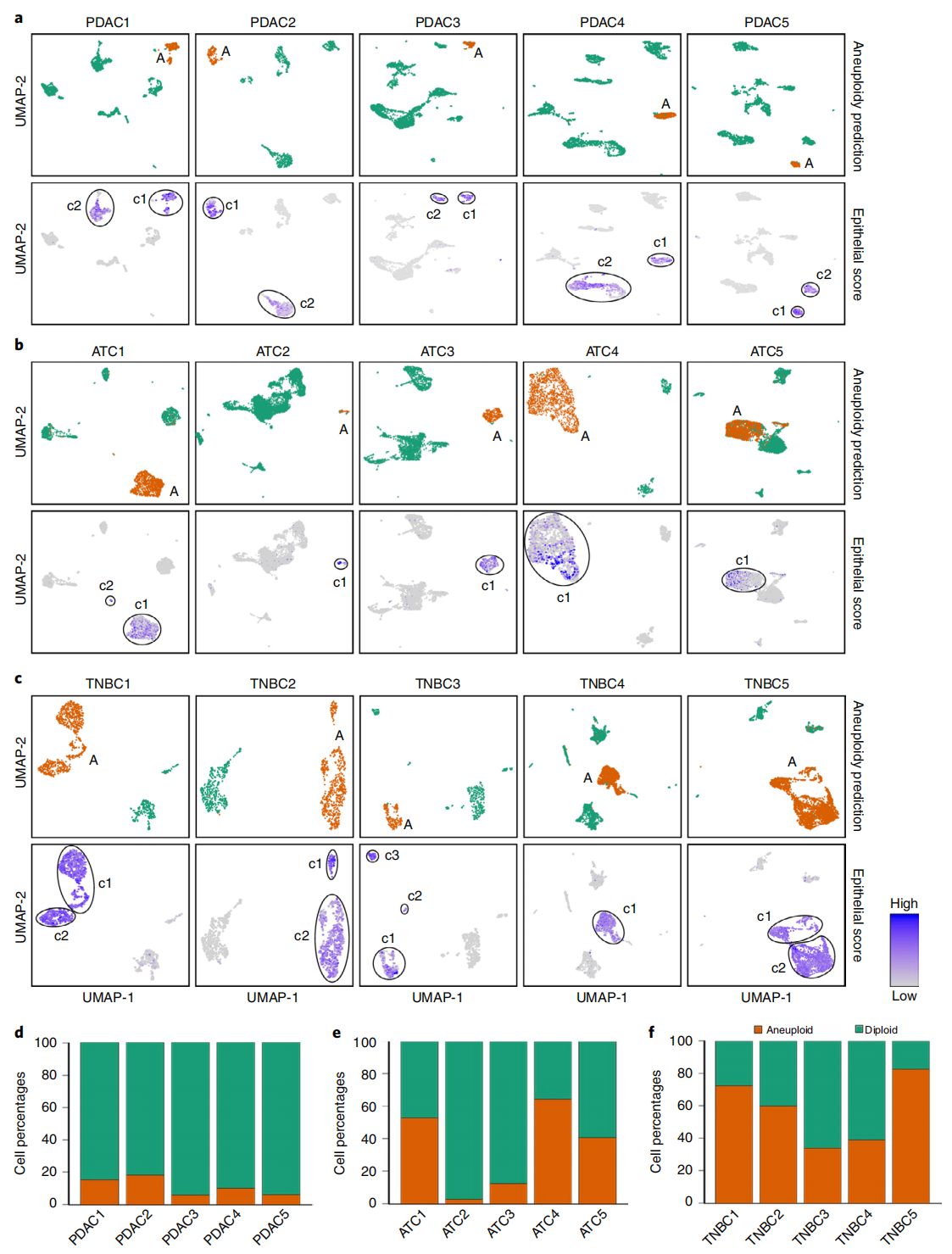 该研究将 CopyKAT 应用于先前发表的五例胰腺腺癌(PDAC)患者的 3′ scRNA-seq 数据,以及该研究新生成的五例三阴性乳腺癌(TNBC)和五例间变性甲状腺癌(ATC)患者的 3′scRNA-seq 数据,以基于拷贝数差异区分肿瘤细胞与正常细胞(图3)。在五例 PDAC 患者的 9,717 个单细胞转录组中,使用 CopyKAT 成功识别出每位个体中的非整倍体肿瘤细胞亚群(图3a)。预测的肿瘤细胞具有全基因组拷贝数变异(CNA),包括常见的染色体扩增 1q、3q、7p、8q、17、19 和 20,以及缺失 3p、6 和 8p,这些变化在 PDAC 中已有报道;而具有二倍体基因组的正常细胞则没有反复出现的 CNA。该研究将分类后的非整倍体肿瘤细胞投影到 UMAP 中,发现其位置与高上皮基因评分的表达簇重叠,该评分基于四个公认的肿瘤上皮标记基因(EPCAM、KRT19、KRT18 和 KRT8)计算。值得注意的是,在五例 PDAC 患者中,全基因组 CNA 仅在两类上皮簇中的一类(c1)中检测到,表明另一类簇(c2)可能为无法单凭基因表达识别的正常二倍体上皮细胞。该研究将 c1 簇指定为肿瘤细胞,因为其对应非整倍体拷贝数谱,并且 KRT19 表达水平更高,该基因是 PDAC 肿瘤中广泛使用的癌细胞标记。通过计算肿瘤细胞与 c1 表达簇的共定位情况,该研究估计 CopyKAT 在肿瘤细胞识别中具有高准确性(98.5%)。基于这些数据,该研究估计肿瘤纯度范围为 6%–18%(图3d),与以往组织病理学数据显示的结果一致,即 PDAC 患者通常因高比例基质细胞而肿瘤纯度较低。