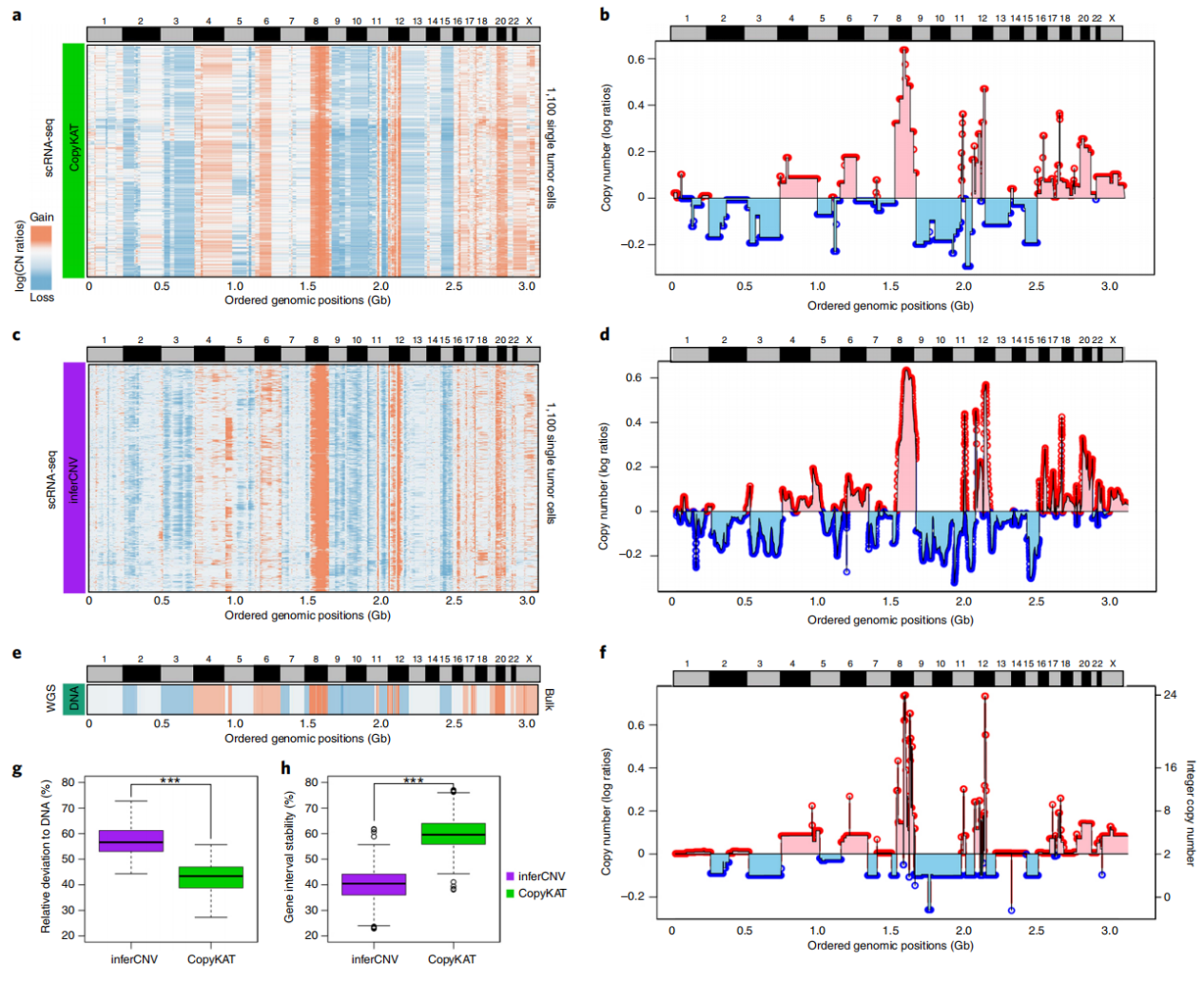 该研究进一步将inferCNV的结果转换为与CopyKAT相同的基因组分辨率(220-kb 可变区间),以便进行比较。虽然inferCNV的信号强度低于CopyKAT,但通过相关性分析(Pearson 相关系数 = 0.79),其结果仍与群体DNA-seq数据参考具有较高一致性(图2c,d)。然而,inferCNV的一个主要局限在于,它只能报告基因窗口的平滑平均值,无法检测染色体断点或拷贝数片段的具体坐标,而这些功能是 CopyKAT 所实现的。该研究进一步通过重复抽样不同基因数间隔的相邻局部区域,计算两种方法推断的拷贝数状态与群体 DNA-seq 拷贝数谱参考的相对距离(方法部分)。分析结果显示,CopyKAT的分割结果显著(P < 0.001,t检验)更接近参考 DNA 拷贝数状态,相比之下,inferCNV 报告的滑动窗口平均值偏离更大(图2g)。此外,CopyKAT 在不同基因窗口大小(5 至 500 个基因)下均表现出更稳定的性能(图2h)。