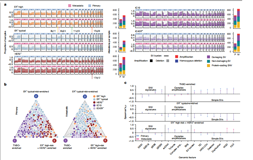 乳腺癌是一种高度异质性疾病,仅通过雌激素受体(ER)、孕激素受体和人表皮生长因子受体2(HER2,由ERBB2基因编码)的表达来判断其预后和治疗,尚不足以涵盖其全部的临床结果和治疗上的弱点。之前,研究者通过转录和基因组学特征定义了11种具有不同临床结果的整合亚型,其中包括4种在诊断数十年后仍有复发风险增加的ER+亚型。在此,为了确定这些亚型是否反映了不同的进化历史、与免疫系统的相互作用以及通路依赖性,研究者建立了一个包含1828例乳腺肿瘤的元队列,覆盖了原位癌、原发浸润癌和转移癌,并进行了全基因组和转录组测序。研究者发现乳腺肿瘤沿着由三种基因组原型限定的连续谱分布。ER+高风险整合亚组的特征是复杂的局灶性扩增,类似于HER2+肿瘤,包括由ER通过R环形成和APOBEC3B编辑诱导的循环型细胞外染色体DNA扩增,这些扩增起源于原位癌病变。相比之下,三阴性肿瘤表现出全基因组不稳定性、串联重复,并富含同源修复缺陷样特征,而ER+典型风险肿瘤在基因组上大多保持稳定。这些基因组原型在2659例原发肿瘤的独立队列中得到复制,它们在肿瘤发生早期就已形成,塑造了肿瘤微环境,并在转移性疾病中得以保留。这些复杂的结构改变有助于复制应激和免疫逃逸,并在整个肿瘤进化过程中持续存在,揭示了潜在的弱点。