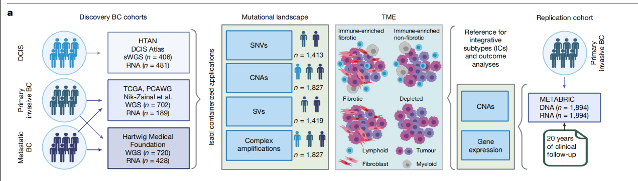 研究首先利用多个发现性队列,包括HTAN、TCGA、PCAWG和Hartwig Medical Foundation的数据,对乳腺癌样本进行全基因组和转录组测序,分析突变特征和肿瘤微环境(TME)。随后,通过独立验证队列METABRIC,对整合亚型(ICs)和结果进行验证,并结合20年的临床随访数据,评估基因组原型与临床结果的相关性。