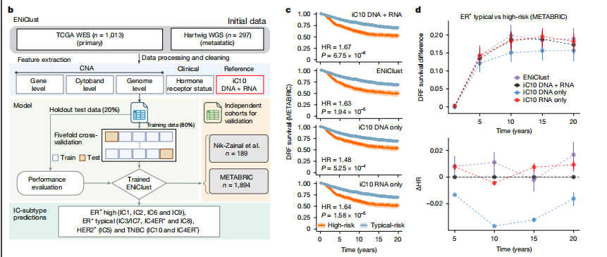 研究深入分析了乳腺癌的整合亚型(IC)的演变过程。通过对1828个样本(包括DCIS、原发性和转移性病变)进行统一的生物信息学分析,识别了单核苷酸变异(SNVs)、拷贝数异常(CNAs)、结构变异(SVs)、环状染色体外DNA(ecDNA)和突变特征。结合METABRIC队列的1894个原发性浸润性肿瘤样本和约20年的临床随访数据,该研究开发了一种名为Ensemble Integrative Clustering(ENiClust)的新方法,能够从全外显子测序或全基因组测序(WGS)数据中准确推断IC亚型(图b展示了开发流程)。从图c、d可以看出,ENiClust的预测结果优于现有的方法,能够更好地对患者进行分层。通过ENiClust分析,发现不同疾病阶段IC亚型的分布存在差异,DCIS中IC5亚型较为丰富,而转移性肿瘤中ER+高风险亚型更为常见。此外,从原位到转移,IC亚型基本保持稳定,这表明乳腺癌亚型的演变可能在肿瘤发生的早期阶段就已经确定。