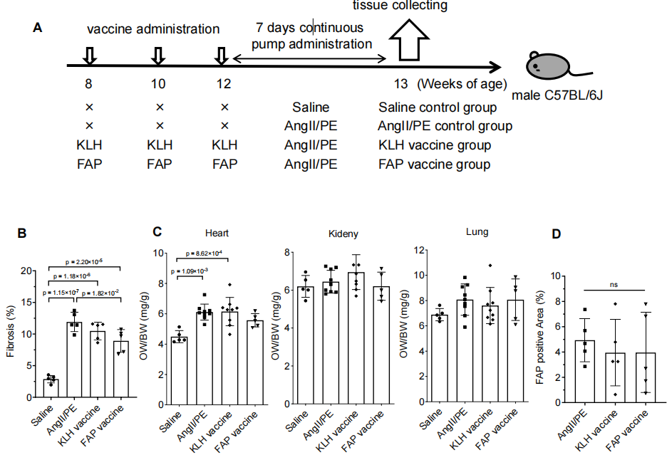 将FAP肽疫苗与胞嘧啶-磷酸-鸟嘌呤(CpG)K3寡核苷酸佐剂联合应用于雄性C57/BL6J小鼠,确认其体内抗FAP抗体滴度升高。在连续给予血管紧张素II(AngII)和去甲肾上腺素(PE)28天后,评估小鼠心脏组织的纤维化程度及肌成纤维细胞的数量。