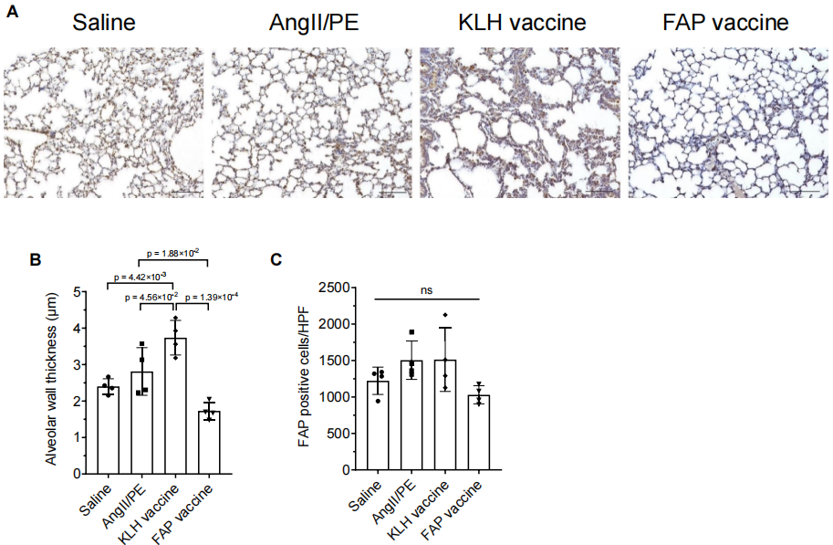 图S9:连续 AngII/PE 给药 28 天后 FAP 疫苗对肺组织的影响