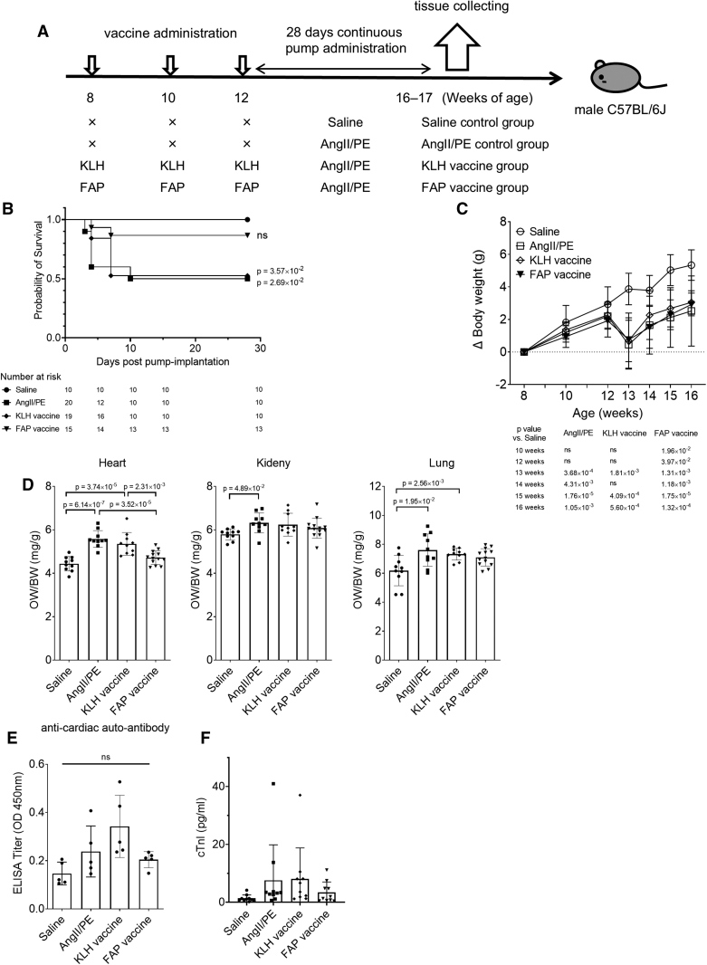 We coadministered a FAP peptide vaccine with a cytosine-phosphate-guanine (CpG) K3 oligonucleotide adjuvant to male C57/BL6J mice and confirmed an elevation in the anti-FAP antibody titer. After continuous angiotensin II and phenylephrine administration for 28 days, we evaluated the degree of cardiac fibrosis and the number of myofibroblasts in cardiac tissues.
