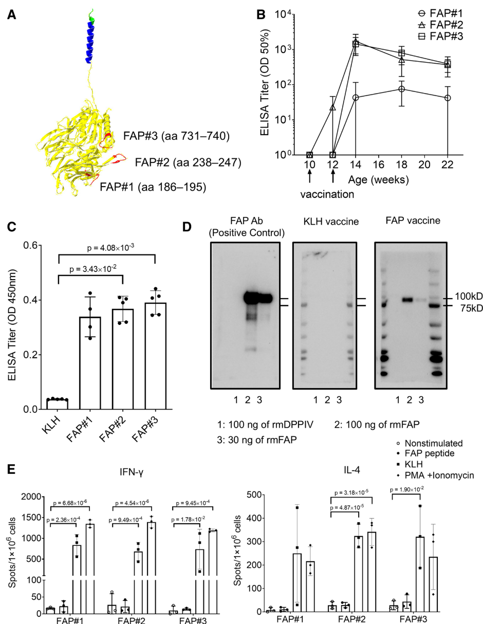 研究者基于FAP蛋白的三维结构进行表位预测的抗原性分析后,从中筛选出了三个潜在的B细胞表位肽段(FAP蛋白中可能被免疫系统识别的部分),作为疫苗的候选成分(图1A)。为了增强这些短肽的免疫原性,将候选肽段化学偶联到载体蛋白钥孔血蓝蛋白(KLH) 上,同时配合CpG佐剂使用。KLH作为大分子载体,可以帮助短肽被免疫系统识别,而CpG则促进Th1型免疫反应,有助于诱导具有效应功能的IgG2a/c等抗体。
