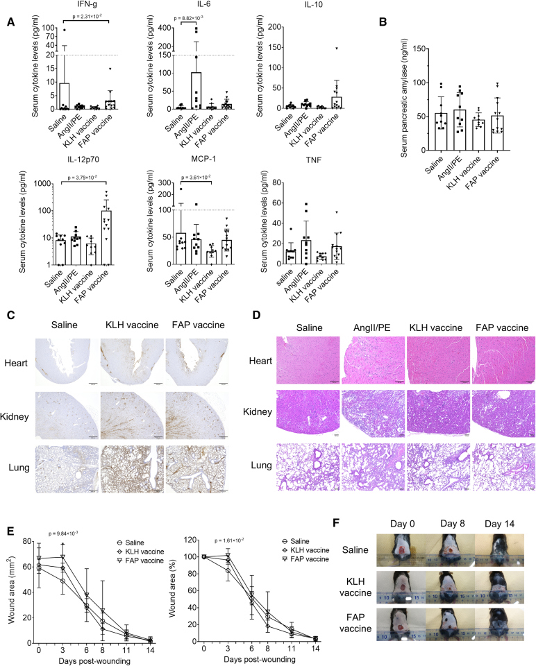 与AngII/PE对照组相比,FAP疫苗接种组小鼠的心脏纤维化显著减少(3.45±1.11% vs. 8.62±4.79%;P=4.59×10−3),FAP免疫组化染色显示FAP阳性细胞的积累同样显著降低(4077±1746 vs. 7327±1741 个细胞/mm²;P=6.67×10−3)。未观察到因FAP疫苗诱导的抗体依赖性细胞毒作用而导致的全身性或器官特异性炎症。尽管肌成纤维细胞的短暂活化在组织修复过程中具有重要作用,但在心肌梗死和皮肤损伤模型中,FAP疫苗未显示不良影响。