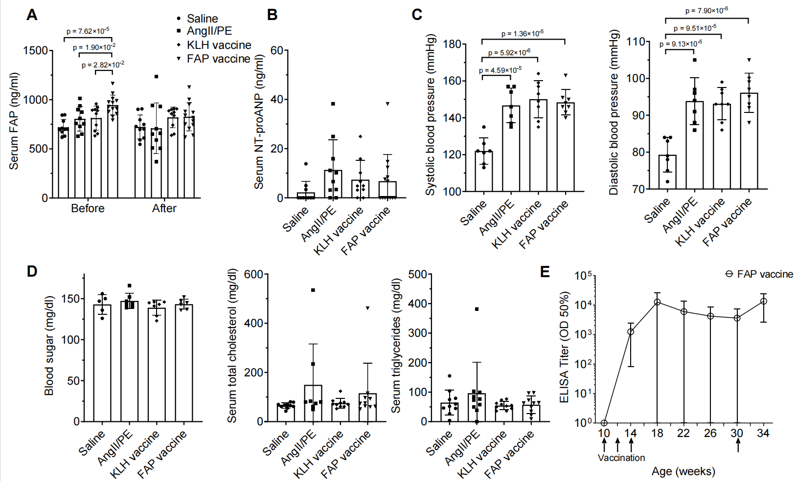 图S3:FAP疫苗在AngII/PE输注小鼠模型中的生理与生化效应评估