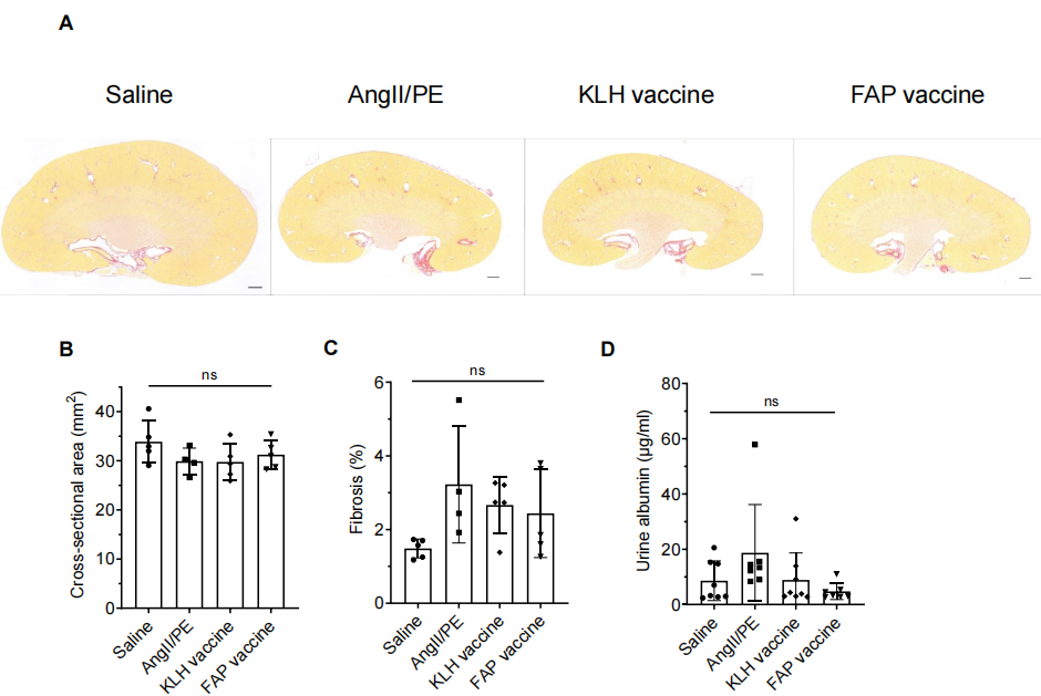 由于AngII可引起肾脏纤维化,研究者进一步评估了肾脏纤维化的程度,结果显示,AngII/PE虽能诱导肾脏纤维化,但免疫组化结果示各组间差异不大(S5A-C)。在功能指标上,尿蛋白在 FAP 疫苗组有下降趋势,说明它可能对肾脏有部分保护作用,但差异未达统计学显著(S5D)。即FAP疫苗能够显著减少心脏纤维化,改善结构性指标,但在短期内无法改善心脏功能。它对肾脏作用有限,显示出一定的组织特异性。