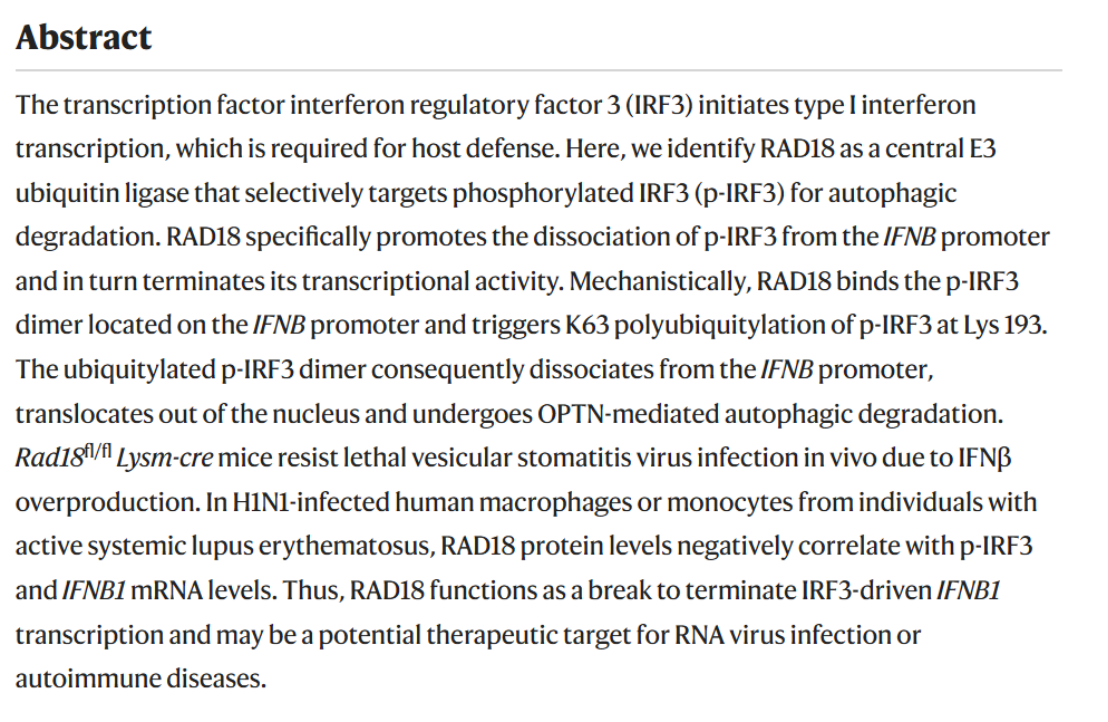 转录因子干扰素调节因子3(IRF3)启动I型干扰素转录,这是宿主防御所必需的。在这里,研究者确定RAD18是一种核心E3泛素连接酶,可选择性地将磷酸化的IRF3(p-IRF3)靶向自噬降解。RAD18特异性地促进p-IRF3从IFNB启动子上的解离,从而终止其转录活性。从机制上讲,RAD18结合位于IFNB启动子上的p-IRF3二聚体,并触发p-IRF3在Lys193处的K63多泛素化。泛素化的p-IRF3二聚体随后从IFNB启动子上解离,转位出细胞核并经历OPTN介导的自噬降解。由于IFNβ的过度产生,Rad18fl/flLysm-cre小鼠在体内能抵抗致死剂量的水疱性口炎病毒感染。在H1N1感染的人类巨噬细胞或活动性系统性红斑狼疮个体的单核细胞中,RAD18蛋白水平与p-IRF3和IFNB1 mRNA水平呈负相关。因此,RAD18起到终止IRF3驱动的IFNB1转录的刹车作用,并且可能是RNA病毒感染或自身免疫性疾病的治疗靶标。