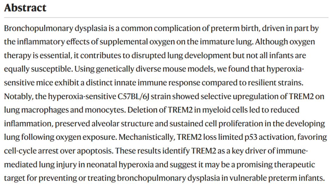支气管肺发育不良是早产的常见并发症,部分原因是补充氧气对未成熟肺部的炎症影响。虽然氧疗是必不可少的,但它会干扰肺部正常发育,不过并非所有婴儿都同样易感。使用遗传多样的小鼠模型,研究者发现对高氧敏感的小鼠与有耐受的小鼠相比表现出独特的先天免疫反应。值得注意的是,对高氧敏感的C57BL/6J小鼠品系在肺巨噬细胞和单核细胞上显示出TREM2的选择性上调。髓样细胞中TREM2的缺失导致炎症减少,肺泡结构得到保留,细胞增殖在高氧暴露后的发育中的肺部得到维持。从机制上讲,TREM2的缺失限制了p53的激活,有利于细胞周期停滞而不是凋亡。这些结果表明TREM2是新生儿高氧血症中免疫介导的肺损伤的关键驱动因素,提示其可能是预防或治疗脆弱早产儿支气管肺发育不良的潜在治疗靶点。