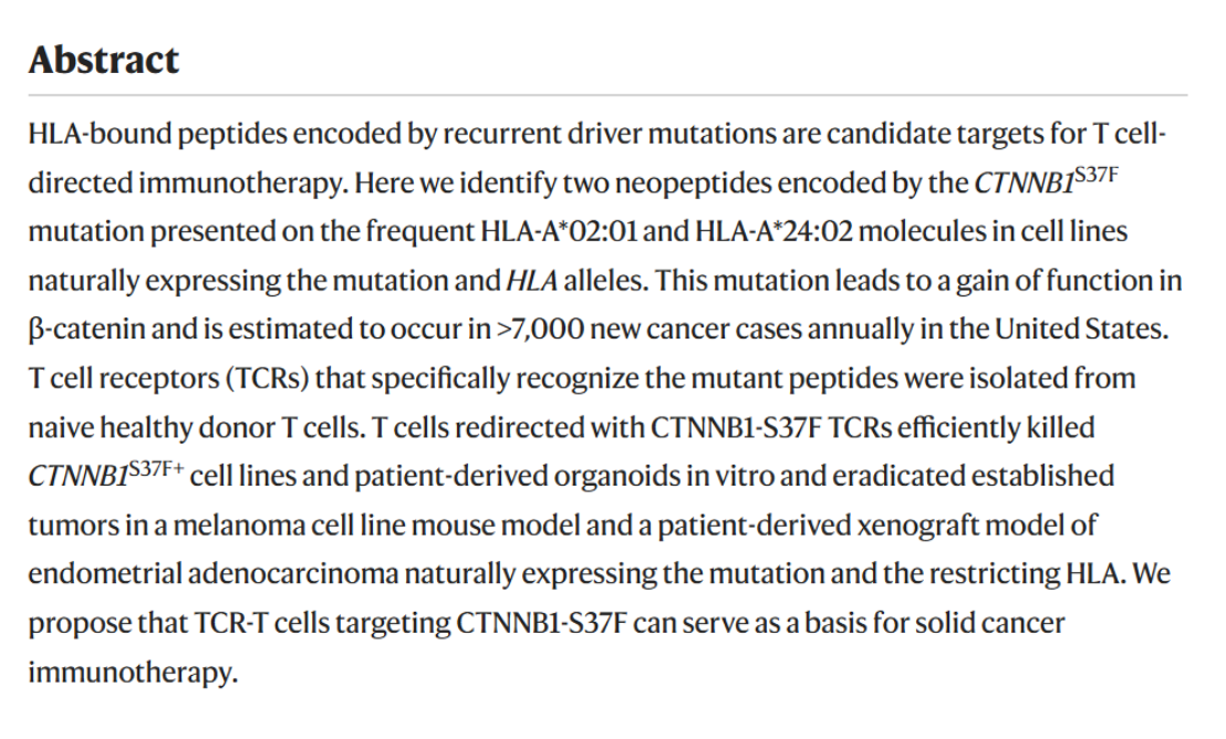 由复发性驱动突变编码的与HLA结合的肽是T细胞定向免疫治疗的候选靶标。该研究确定了两种由CTNNB1S37F突变编码的新肽,它们在自然表达该突变和HLA等位基因的细胞系中呈现在常见的HLA-A*02:01和HLA-A*24:02分子上。这种突变会导致β-catenin的功能获得,据估计每年在美国有超过7,000例新的癌症病例会发生这种突变。从健康供体的初始T细胞分离出特异性识别突变肽的T细胞受体(TCRs)。用CTNNB1-S37F TCRs重定向的T细胞在体外有效地杀死了CTNNB1S37F+细胞系和患者来源的类器官,并在黑色素瘤细胞系小鼠模型和自然表达该突变和限制性HLA的内膜腺癌患者来源的异种移植模型中根除了已建立的肿瘤。该研究建议,以CTNNB1-S37F为靶标的TCR-T细胞可以作为实体癌免疫治疗的基础。