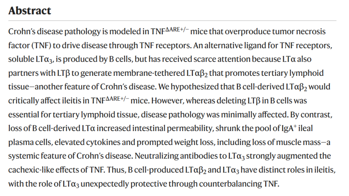 克罗恩病的病理可在TNFΔARE+/-小鼠中模拟,这些小鼠过度产生肿瘤坏死因子(TNF)通过TNF受体驱动疾病。B细胞产生的可溶性LTα3作为TNF受体的替代配体,因其常与LTβ组合形成膜锚定LTαβ2(该复合物可促进三级淋巴组织形成——克罗恩病的另一病理特征)而较少受到关注。该研究假设B细胞来源的LTαβ2将严重影响TNFΔARE+/-小鼠的回肠炎。然而,虽然删除B细胞中的LTβ对三级淋巴组织至关重要,但疾病病理影响最小。相比之下,缺乏B细胞来源的LTα会增加肠道通透性,减少IgA+回肠浆细胞的数量,增加细胞因子并导致体重减轻,包括肌肉质量的减少——这是克罗恩病的全身特征。中和LTα3的抗体会强烈增强TNF的恶病质样效应。因此,B细胞产生的LTαβ2和LTα3在回肠炎中具有不同的作用,其中LTα3通过平衡TNF效应发挥出人意料的保护作用。