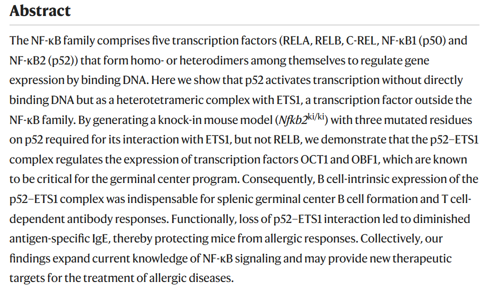 NF-κB家族由五个转录因子(RELA、RELB、C-REL、NF-κB1(p50)和NF-κB2(p52))组成,它们之间形成同二聚体或异二聚体,通过结合DNA来调节基因表达。在这里,研究者展示了p52并非直接结合DNA,而是通过与ETS1(一个NF-κB家族之外的转录因子)形成异四聚体复合物来激活转录。通过生成一种敲入小鼠模型(Nfkb2ki/ki),该模型在p52上具有三个与ETS1相互作用所必需的突变残基,而不影响RELB,该研究证明了p52-ETS1复合物调节转录因子OCT1和OBF1的表达,这两者已知对生发中心程序至关重要。因此,B细胞内源性表达的p52-ETS1复合物对于脾生发中心B细胞的形成和T细胞依赖性抗体反应是必不可少的。在功能上,p52-ETS1相互作用的丧失导致抗原特异性IgE减少,从而保护小鼠免受过敏反应的影响。总的来说,该研究结果扩展了目前对NF-κB信号传导的认识,并可能为过敏性疾病的治疗提供新的治疗靶点。