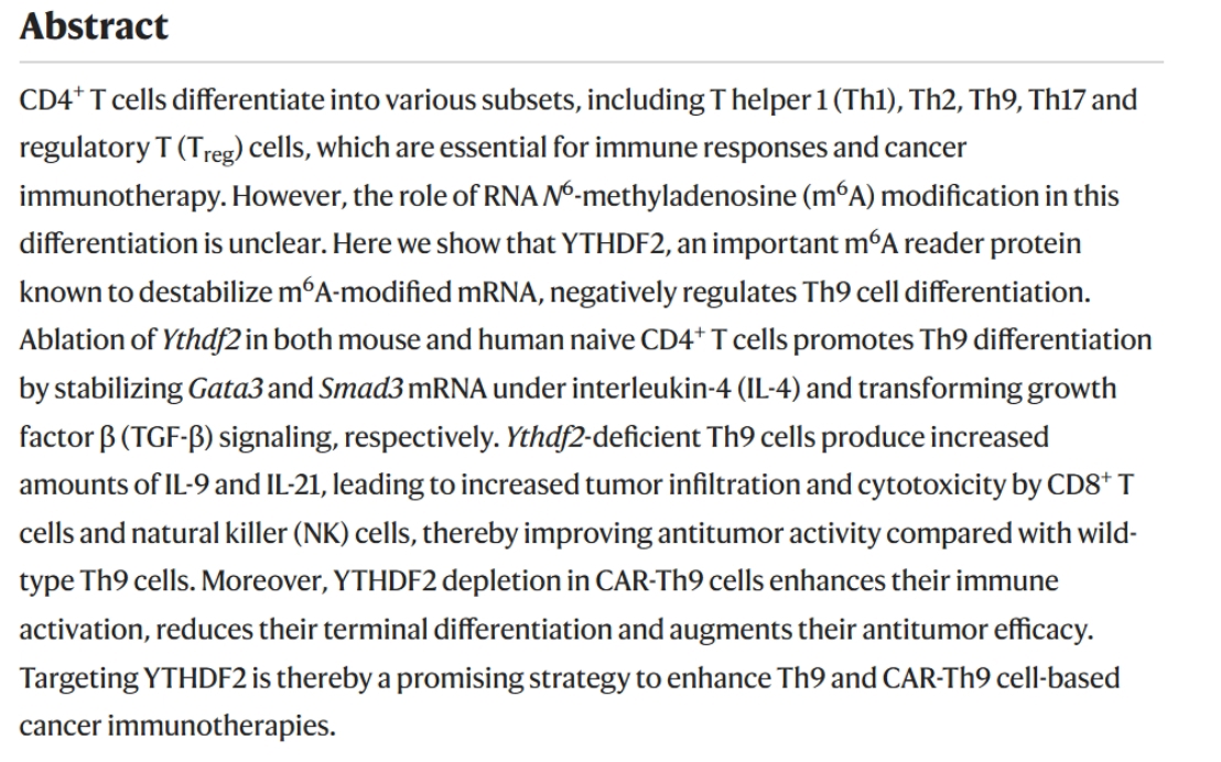 CD4+ T细胞可分化为多种亚群,包括T辅助细胞(Th1)、Th2、Th9、Th17和调节性T细胞(Treg),这些细胞亚群对免疫应答和癌症免疫治疗至关重要。然而,RNA N6-甲基腺苷(m6A)修饰在这些细胞分化中的作用尚不清楚。在这里,该研究展示了YTHDF2(一种已知会破坏m6A修饰的mRNA的重要m6A阅读蛋白)负调控Th9细胞的分化。小鼠和人类初始CD4+ T细胞中Ythdf2的缺失通过分别在白细胞介素-4(IL-4)和转化生长因子β(TGF-β)信号传导下稳定Gata3和Smad3 mRNA来促进Th9细胞的分化。缺乏Ythdf2的Th9细胞产生更多的IL-9和IL-21,导致CD8+ T细胞和自然杀伤(NK)细胞的肿瘤浸润和细胞毒性增加,从而与野生型Th9细胞相比提高了抗肿瘤活性。此外,CAR-Th9细胞中YTHDF2的耗竭增强了它们的免疫激活,减少了它们的终末分化,并增强了它们的抗肿瘤功效。因此,靶向YTHDF2是一种增强Th9和CAR-Th9细胞癌症免疫治疗的有前景的策略。
