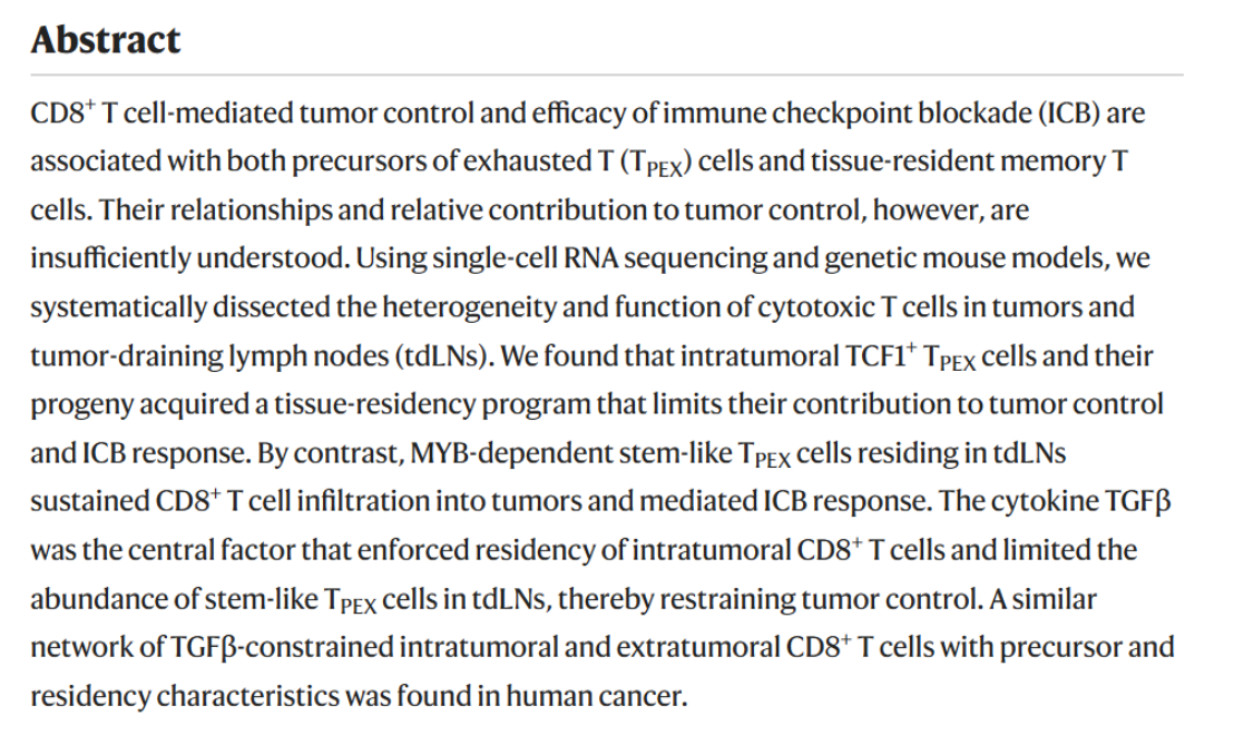 CD8+ T细胞介导的肿瘤控制和免疫检查点阻断(ICB)的疗效与耗竭T细胞(TPEX)的前体细胞和组织驻留记忆T细胞都有关联。然而,它们之间的关系及其对肿瘤控制的相对贡献尚不完全清楚。通过单细胞RNA测序和基因小鼠模型,研究者系统地解析了肿瘤和肿瘤引流淋巴结(tdLNs)中细胞毒性T细胞的异质性和功能。发现肿瘤内TCF1+ TPEX细胞及其后代获得了一种组织驻留程序,这限制了它们对肿瘤控制和ICB反应的贡献。相比之下,驻留在tdLNs中的MYB依赖性干细胞样TPEX细胞维持了CD8+ T细胞向肿瘤的浸润并介导了ICB反应。细胞因子TGFβ是强制肿瘤内CD8+ T细胞驻留并限制tdLNs中干细胞样TPEX细胞丰度的关键因素,从而抑制肿瘤控制。在人类癌症中也发现了类似的TGFβ限制的肿瘤内和肿瘤外CD8+ T细胞网络,这些细胞具有前体细胞和驻留特征。