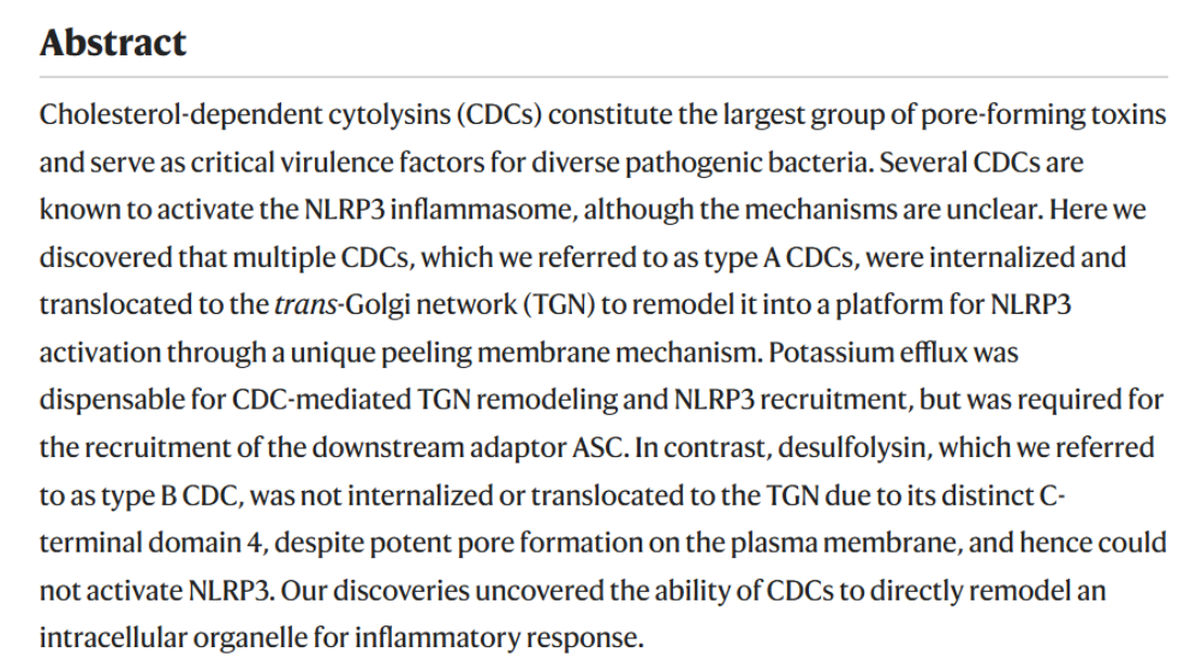 胆固醇依赖性细胞溶素(CDCs)构成了最大的一类成孔毒素,是多种病原细菌的关键毒力因子。尽管已知几种CDC能激活NLRP3炎症小体,但机制尚不清楚。在这里,该研究发现多种CDC(A型CDC)被内化并转位至高尔基体反面网络(TGN),通过一种独特的膜剥离机制将其重塑为NLRP3激活的平台。钾离子外流对于CDC介导的TGN重塑和NLRP3募集是非必需的,但对于下游衔接蛋白ASC的募集是必需的。相比之下,尽管去磺胺素(B型CDC)在质膜上能有效地形成孔,但由于其独特的C端结构域4,它不会被内化或转位到TGN,因此无法激活NLRP3。该研究发现揭示了CDC直接重塑细胞内细胞器以响应炎症的能力。
