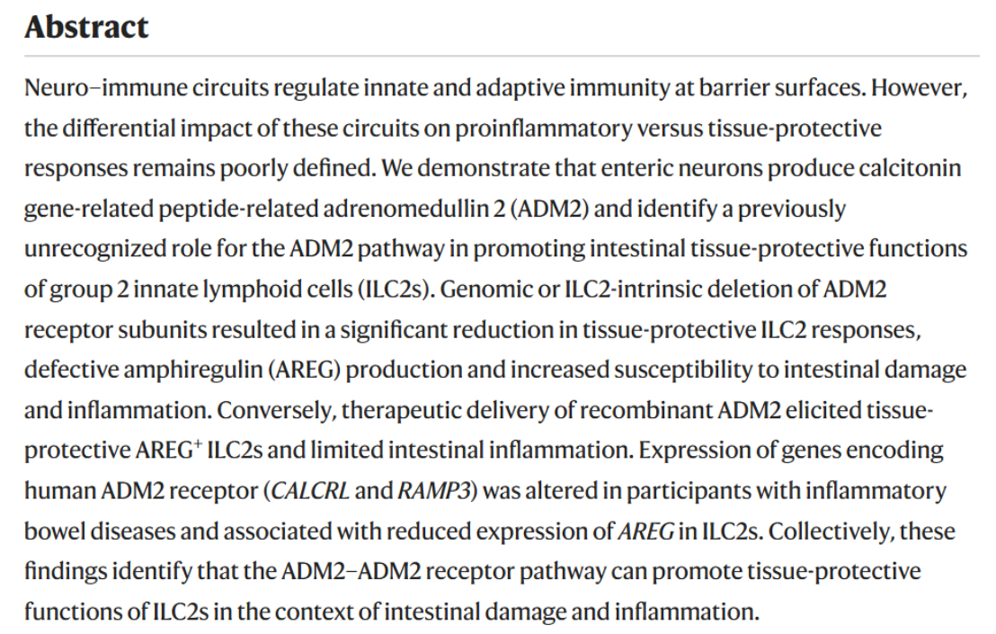 神经-免疫回路在屏障表面调节先天免疫和适应性免疫。然而,这些回路对促炎反应与组织保护反应的不同影响仍然不明确。该研究证明了肠道神经元产生降钙素基因相关肽相关的肾上腺髓质素2(ADM2),并确定了ADM2通路在促进2型先天淋巴细胞(ILC2s)的肠道组织保护功能中的一个以前未被认识到的作用。基因层面或ILC2细胞内源性缺失ADM2受体亚基会导致组织保护性ILC2反应显著减少,双调蛋白(AREG)产生缺陷,以及对肠道损伤和炎症的敏感性增加。相反,重组ADM2的治疗性递送诱导组织保护性AREG+ ILC2s,并限制肠道炎症。编码人类ADM2受体(CALCRL和RAMP3)的基因在炎症性肠病患者中的表达发生改变,并与ILC2s中AREG的表达降低相关。总的来说,这些发现确定了ADM2-ADM2受体通路可以在肠道损伤和炎症的背景下促进ILC2s的组织保护功能。