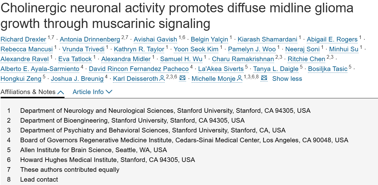 胆碱能神经元活动通过毒蕈碱信号促进弥漫性中线胶质瘤生长