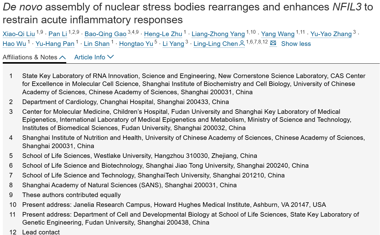 以卫星III(SatIII)RNA为标志的无膜核应激小体(nSBs),是灵长类动物细胞感知应激后形成的特异性结构。本研究发现,应激发生后短时间内,SatIIIDNA、SatIIIRNA及30种nSB相关蛋白会组装成结构有序的复合物。其中,被激活的SatIII异染色质位点会快速扩张,导致其与邻近基因的空间距离缩短,进而促进这些基因的表达——这其中包括转录抑制因子NFIL3(已知可抑制促炎细胞因子的产生)。将NFIL3基因座重排至nSB区域内,可提高NFIL3染色质的可及性,同时使NFIL3启动子更易与转录因子热休克转录因子1(HSF1)和含溴结构域蛋白4(BRD4)结合;而应激状态下,HSF1与BRD4也会被招募至nSBs中。在热休克联合病原体相关分子模式(PAMP)处理的人外周血单个核细胞(PBMC)来源巨噬细胞中,SatIII与NFIL3的表达水平显著升高,且NFIL3的高表达可抑制关键促炎细胞因子的产生。更重要的是,在脓毒症患者中,NFIL3的表达水平与SatIII的激活程度呈正相关,而这一过程又与患者生存率呈正相关。上述结果表明,nSBs在抑制过度炎症反应中发挥关键作用。