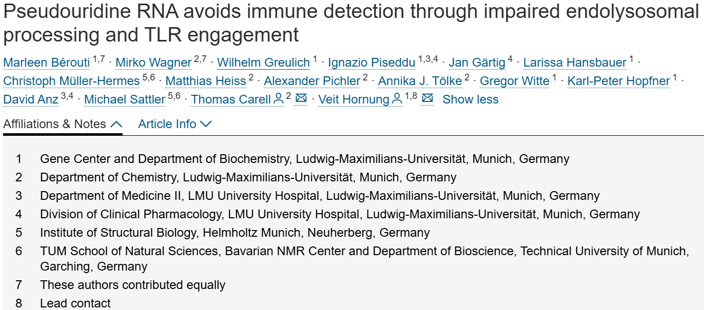 Toll样受体(Toll-likereceptors,TLRs)对外源RNA的识别是机体抵御病原体的核心环节。TLR7与TLR8通过两个不同的结合口袋,识别内体溶酶体核酸酶产生的RNA降解产物。内源性RNA中存在的修饰可抑制TLR激活,其中值得注意的是,含假尿苷(pseudouridine)的RNA不具备免疫刺激活性。事实上,这一特性对mRNA技术在医学领域的成功应用至关重要。然而,含假尿苷RNA实现免疫规避的分子机制至今尚未明确。本研究发现,核酸酶RNaseT2与PLD外切核酸酶无法充分加工含假尿苷的RNA,因而无法生成可激活TLR的配体。作为第二重安全机制,TLR8不会将假尿苷视为其第一个结合口袋的配体,而TLR7也不会将含假尿苷的RNA视为其第二个结合口袋的配体。有趣的是,医学上常用的N1-甲基假尿苷(N1-methylpseudouridine)同样能规避RNaseT2、PLD3及PLD4的加工,但可直接激活TLR8。综上,本研究结果为RNA感知TLRs如何实现自身免疫规避(避免激活针对内源性RNA的免疫反应)提供了分子层面的解释。