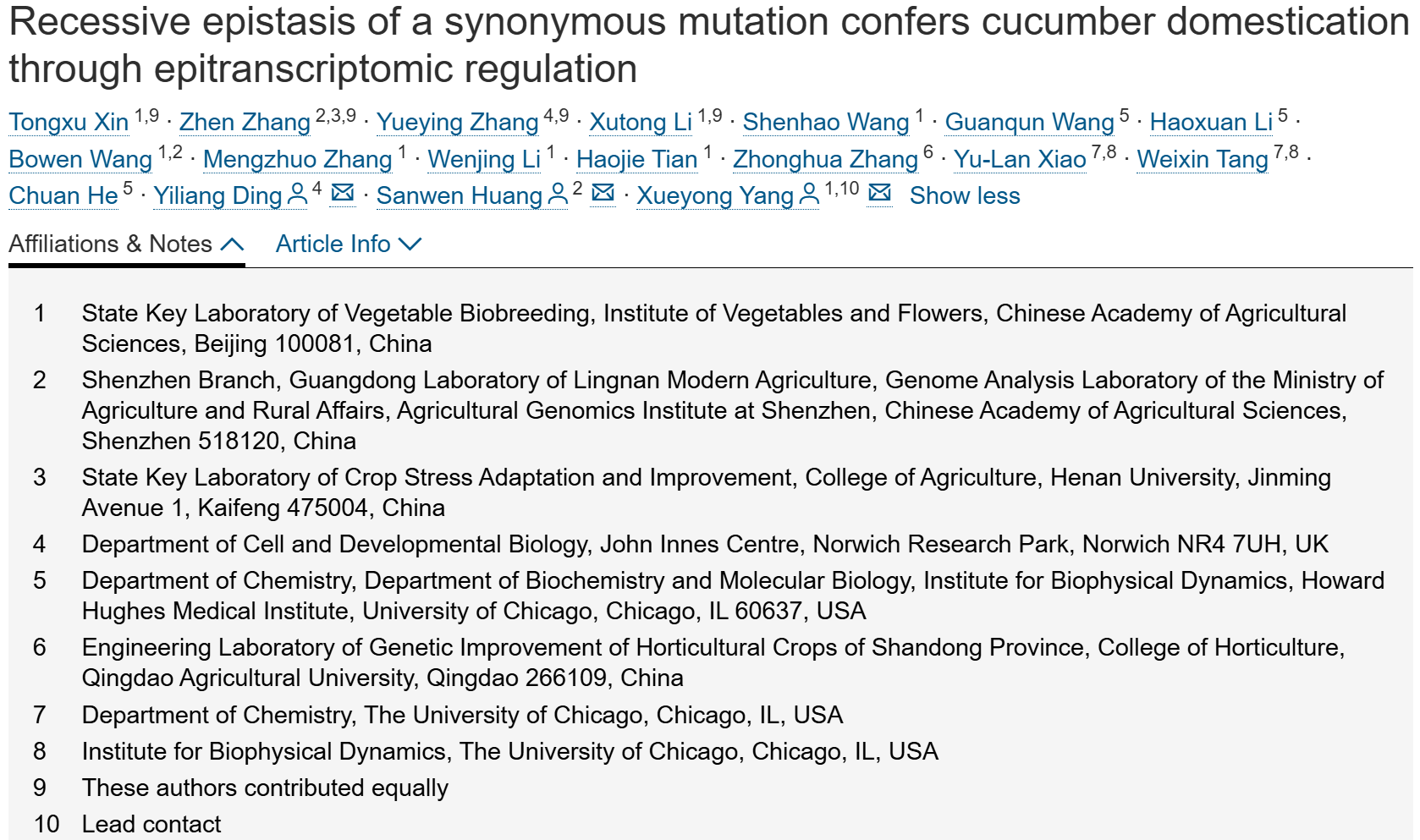 一个同义突变的隐性交互作用通过表观转录调控促进了黄瓜的栽培过程