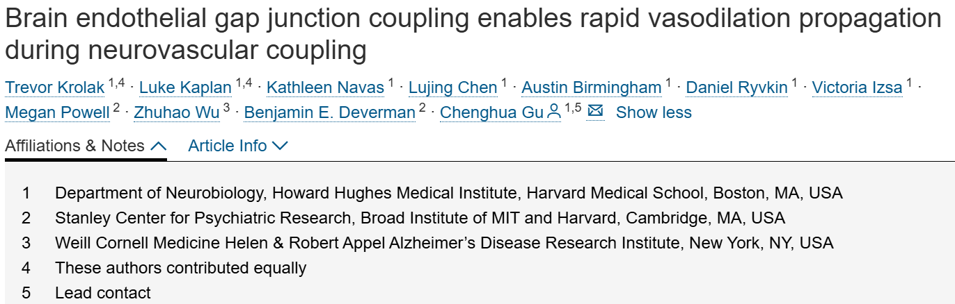 为满足大脑实时的能量需求,神经激活会迅速增加局部血流。这一被称为“神经血管耦合”的过程,涉及大脑动脉网络快速且协同的舒张。本研究证实,在神经血管耦合过程中,内皮缝隙连接可通过血管系统实现血管舒张信号的长距离传导。这些缝隙连接的分子组成沿动静脉轴呈分区分布,其中动脉是耦合最强的区段。在清醒小鼠模型中,本研究结合光遗传学技术与视觉刺激实验发现:对动脉内皮细胞特异性敲除连接蛋白37(Cx37)和连接蛋白40(Cx40),会完全破坏动脉缝隙连接耦合,并导致血管舒张功能受损。具体而言,研究证实动脉内皮缝隙连接耦合不仅决定了神经活动引发的血管舒张传导速度,还决定了其空间范围。这些发现表明,内皮缝隙连接可作为神经血管耦合的“信号通路”,为大脑灵活且高效分配有限能量资源提供支持。