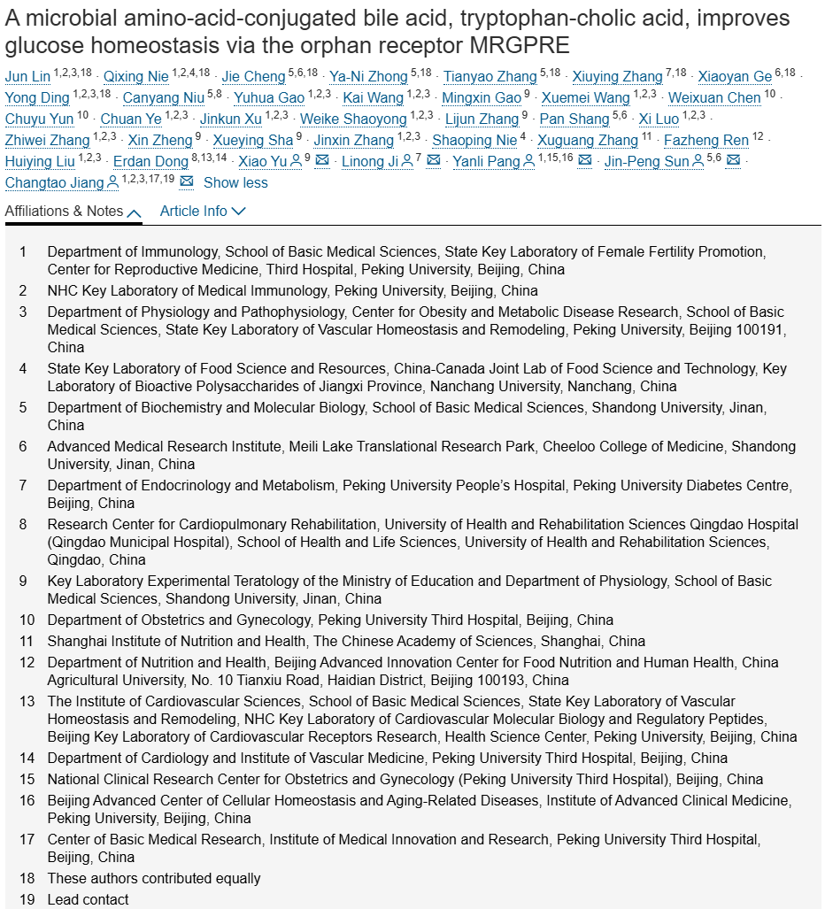 一种由微生物产生的氨基酸与胆酸的结合物——色氨酸-胆酸可通过“孤儿受体”MRGPRE 改善血糖平衡