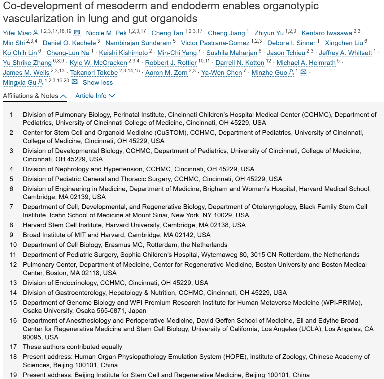 中胚层和内胚层的共同发育使肺和肠道类器官能够生成器官型血管