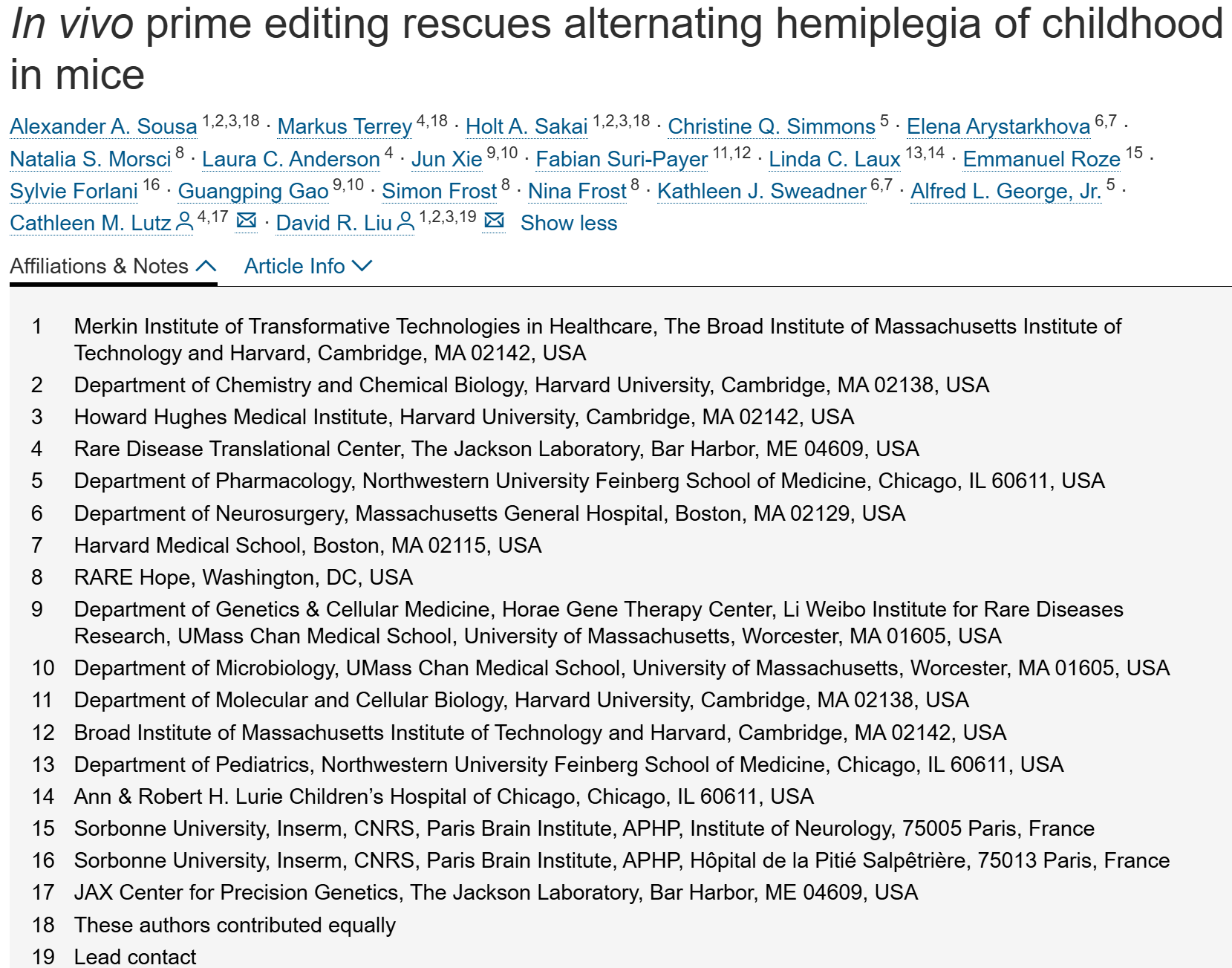 儿童交替性偏瘫(AlternatingHemiplegiaofChildhood,AHC)是一种尚无疾病修饰治疗手段的神经发育障碍性疾病。编码钠钾ATP酶(Na+/K+ATPase)亚基的ATP1A3基因突变是70%AHC病例的原因。本研究提出了利用引导编辑(primeediting,PE)和碱基编辑(baseediting,BE)技术的治疗策略,在人类细胞及两种AHC小鼠模型中纠正ATP1A3(人源基因)与Atp1a3(鼠源基因)突变。研究人员通过PE和BE技术,以43%–90%的效率成功纠正了5种常见的ATP1A3突变。在两种AHC小鼠模型中,经AAV9(腺相关病毒9型)介导的体内引导编辑,可纠正中枢神经系统(CNS)内Atp1a3基因的D801N与E815K突变;在大脑皮层整体组织中,DNA水平的纠正效率最高达48%,mRNA水平的纠正效率最高达73%。体内引导编辑可改善具有临床相关性的表型,具体包括:恢复钠钾ATP酶活性;改善阵发性发作、运动功能缺陷与认知障碍;显著延长动物寿命。本研究表明,引导编辑有望成为AHC的潜在治疗手段,同时证实了引导编辑技术治疗动物神经系统疾病的能力。