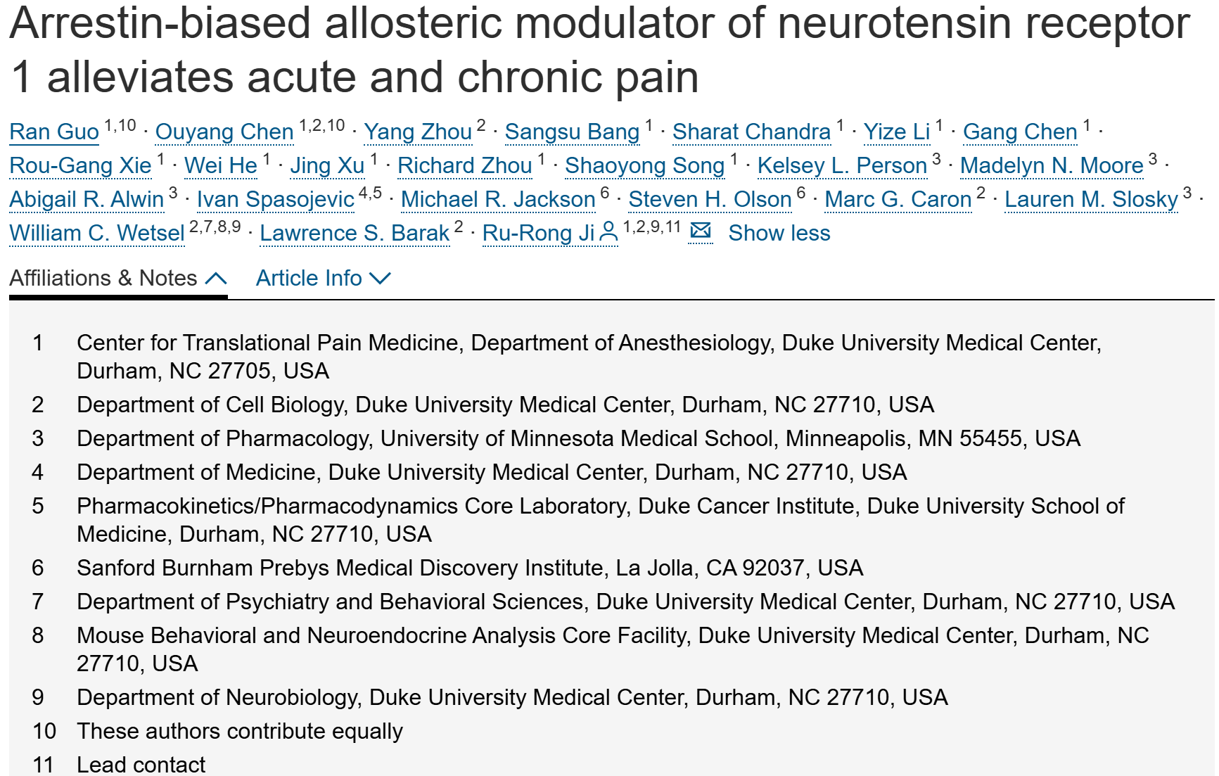 抑制蛋白偏向性的神经降压素受体1变构调节剂可以缓解急性和慢性疼痛
