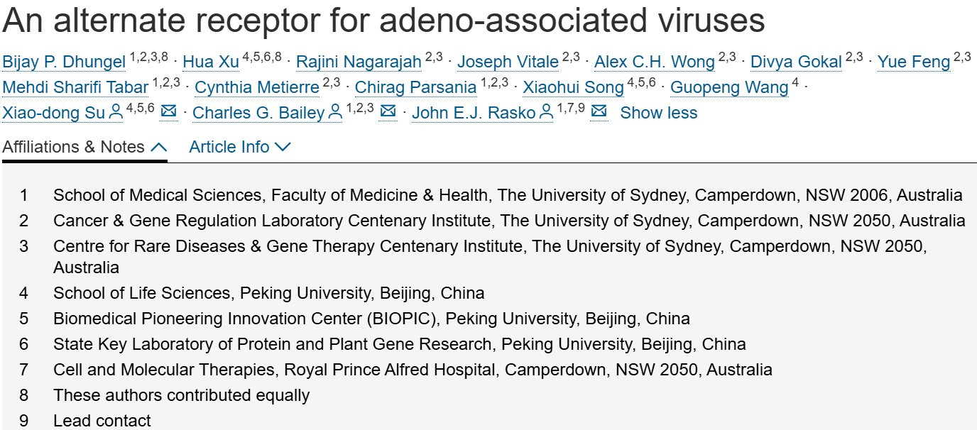 使用腺相关病毒(adeno-associatedvirus,AAV)载体的全身性基因治疗已获批用于治疗多种遗传性疾病,但高载体剂量相关的挑战与毒性问题仍未解决。本研究报道了一种新的AAV替代受体——AAVR2(即羧肽酶D,carboxypeptidaseD,CPD),该受体与多血清型AAV通用受体(AAVR)完全不同。AAVR2可介导E进化枝AAV(包括AAV8)的转导,并为AAV11和AAV12确定了一条不依赖AAVR的特异性转导通路。通过冷冻电镜(cryo-electronmicroscopy,cryo-EM)技术,本研究明确了AAV8衣壳与AAVR2之间的直接结合,并鉴定出二者结合的关键氨基酸残基。研究发现,AAV8通过其可变区VIII(variableregionVIII)直接结合AAVR2的羧肽酶样结构域1(carboxypeptidase-likedomain1);同时证实,可通过生物工程改造使原本不结合AAVR2的AAV衣壳获得与AAVR2结合的能力。最后,本研究通过在体内过表达具有最小功能的AAVR2片段,成功增强了AAV的体内转导效率。该研究不仅深化了对AAV生物学机制的理解,更为开发可临床应用的解决方案、降低AAV载体剂量相关毒性提供了重要思路。