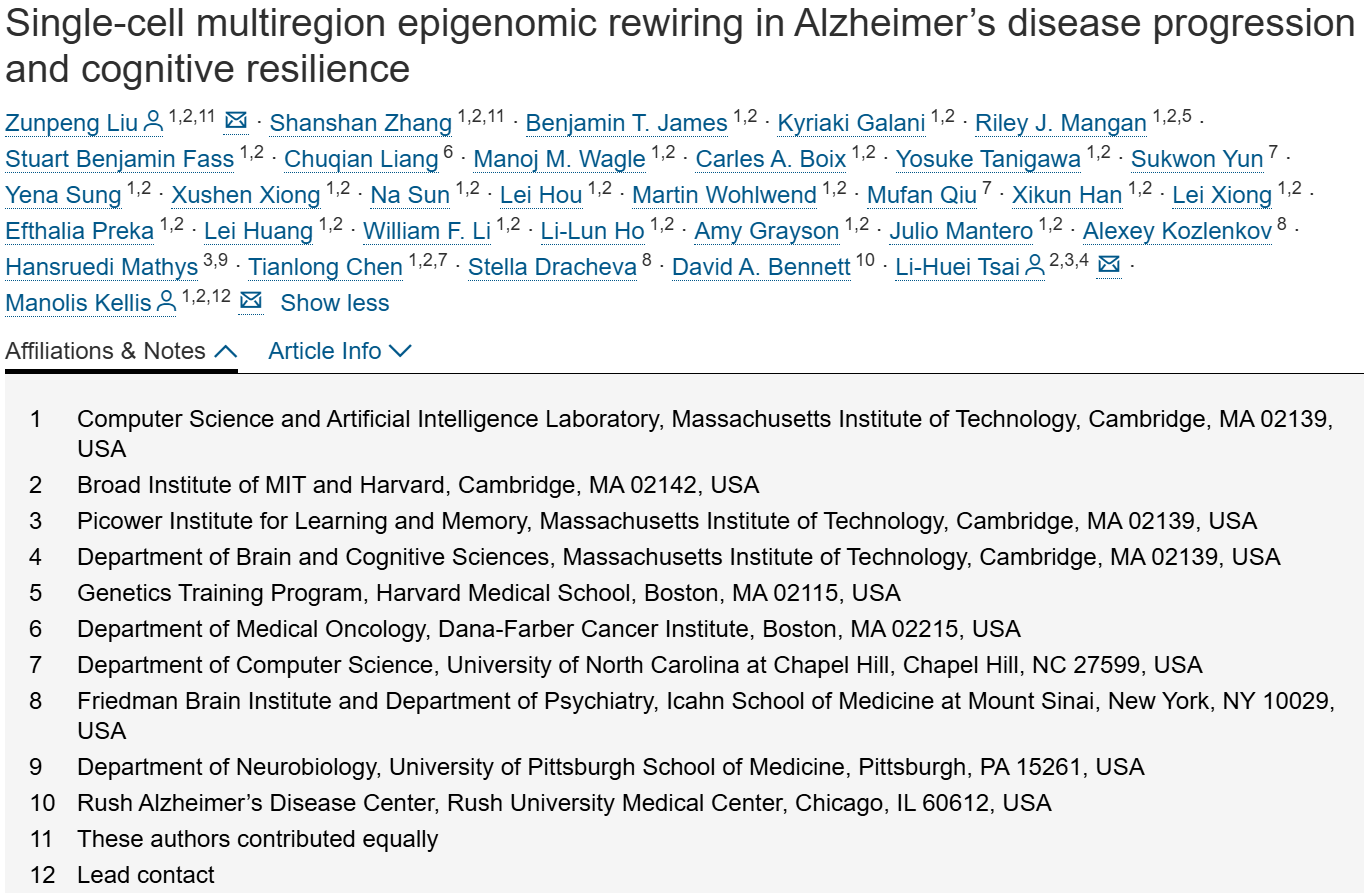 阿尔茨海默病(AD)是一种以进行性认知功能下降为特征的神经退行性疾病,但其表观遗传基础仍不明确。本研究对111名AD患者和健康对照者的384份死后脑组织样本(涵盖6个脑区)进行分析,生成并整合了350万个细胞的单细胞表观基因组图谱与转录组图谱。研究鉴定出超过100万个候选顺式调控元件(cCRE),这些元件在67种细胞亚型中可归类为123个调控模块。通过明确大规模表观基因组区室及单细胞表观基因组信息,并描述其在AD中的动态变化,本研究发现:在AD进展过程中,表观基因组出现广泛松弛现象,且存在脑区特异性和细胞类型特异性的表观基因组侵蚀特征。这些表观基因组稳定性动态变化与以下因素密切相关:细胞类型比例改变、神经胶质细胞状态转换,以及与AD病理特征、认知障碍和认知韧性相关的表观基因组与转录组协同失调。本研究为理解AD进展机制和认知韧性提供了关键见解,同时构建了全面的单细胞多组学图谱,助力深化对AD的认知。
