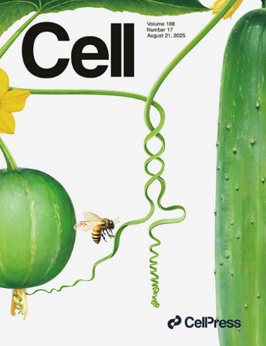 封面内容:同义突变曾被称为“沉默突变”,如今正日益引发生物学家的关注。在本期《Cell》杂志中,Xin等人以生物体为研究对象,揭示了同义突变通过m6A修饰及RNA结构介导的表观转录组调控,实现对驯化性状的调控作用。封面图像将卷曲的黄瓜卷须转化为RNA链,其中野生黄瓜的卷须上附着一只蜜蜂,以此象征m6A修饰,形象地展现了驯化过程中同义突变如何改变m6A修饰与RNA结构。