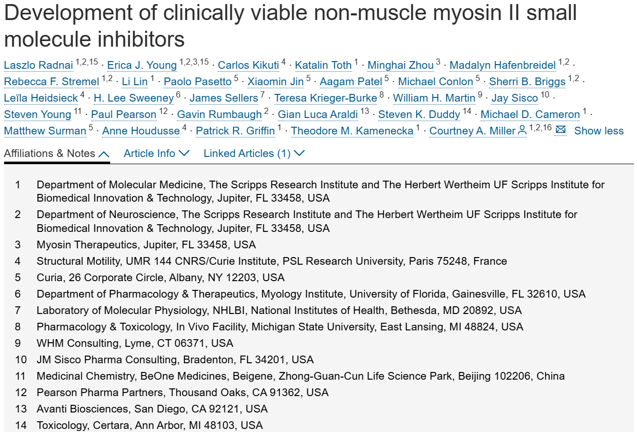 非肌肉肌球蛋白II(non-musclemyosinII,NMII)是一类分子马达蛋白,可调控胞质分裂、神经元可塑性等关键生理过程,具有巨大的治疗潜力。然而,由于缺乏具有选择性的研究工具,其治疗潜力向体内应用的转化一直受到阻碍。最典型的问题是,非选择性抑制剂会同时使NMII与心脏功能关键调控因子——心肌肌球蛋白II(cardiacmusclemyosinII,CMII)失活。本研究通过合理药物设计,开发出一系列NMII抑制剂(包括MT-228及临床候选药物MT-110)。这类抑制剂可优先选择性靶向NMII而非CMII,从而显著提升药物耐受性。研究显示,MT-228与MT-110具备优异特性,不仅血脑屏障穿透能力强,还在甲基苯丙胺使用障碍(methamphetamineusedisorder,MUD)的临床前模型中展现出疗效——目前美国食品药品监督管理局(FDA)尚未批准任何针对MUD的治疗药物。此外,MT-228与肌球蛋白II的结合结构,为其对NMII而非CMII的选择性作用机制提供了分子层面的解释。这些NMII抑制剂具有较宽的治疗窗口,不仅为科学界研究NMII功能提供了宝贵工具,也为MUD的临床治疗提供了极具潜力的候选药物。