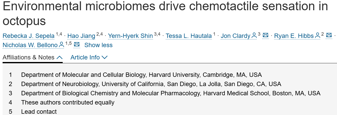 封面内容:尽管微生物组与宿主间相互作用的重要性已逐渐明确,但动物是否会利用无处不在的外界微生物信号来导航周围环境,目前尚不清楚。在本期《Cell》杂志中,Sepela等人研究发现,章鱼可通过“触觉味觉”(tastebytouch)化学触觉受体探测环境微生物组,从而区分猎物或后代与海底岩石及岩缝。这些不同的微生物组信号会差异性激活受体,分别调控章鱼的捕食行为与亲代抚育行为。该研究揭示了动物利用环境微生物组指导自身行为的普遍规律。