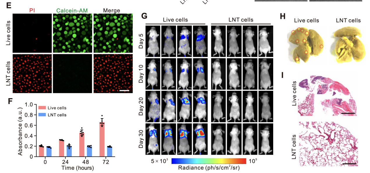 活/死细胞染色:采用钙黄绿素乙酰氧甲酯(calcein-AM)/碘化丙啶(PI)双染法,将LNT-A549细胞与活A549细胞分别接种于共聚焦培养皿,加入适量双染试剂,37℃孵育30分钟,激光扫描共聚焦显微镜下观察荧光信号(活细胞呈绿色荧光,死细胞呈红色荧光)。calcein-AM/PI双染结果显示,LNT-A549细胞均呈现红色荧光,无绿色荧光信号,表明细胞已完全灭活(图1E)。