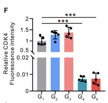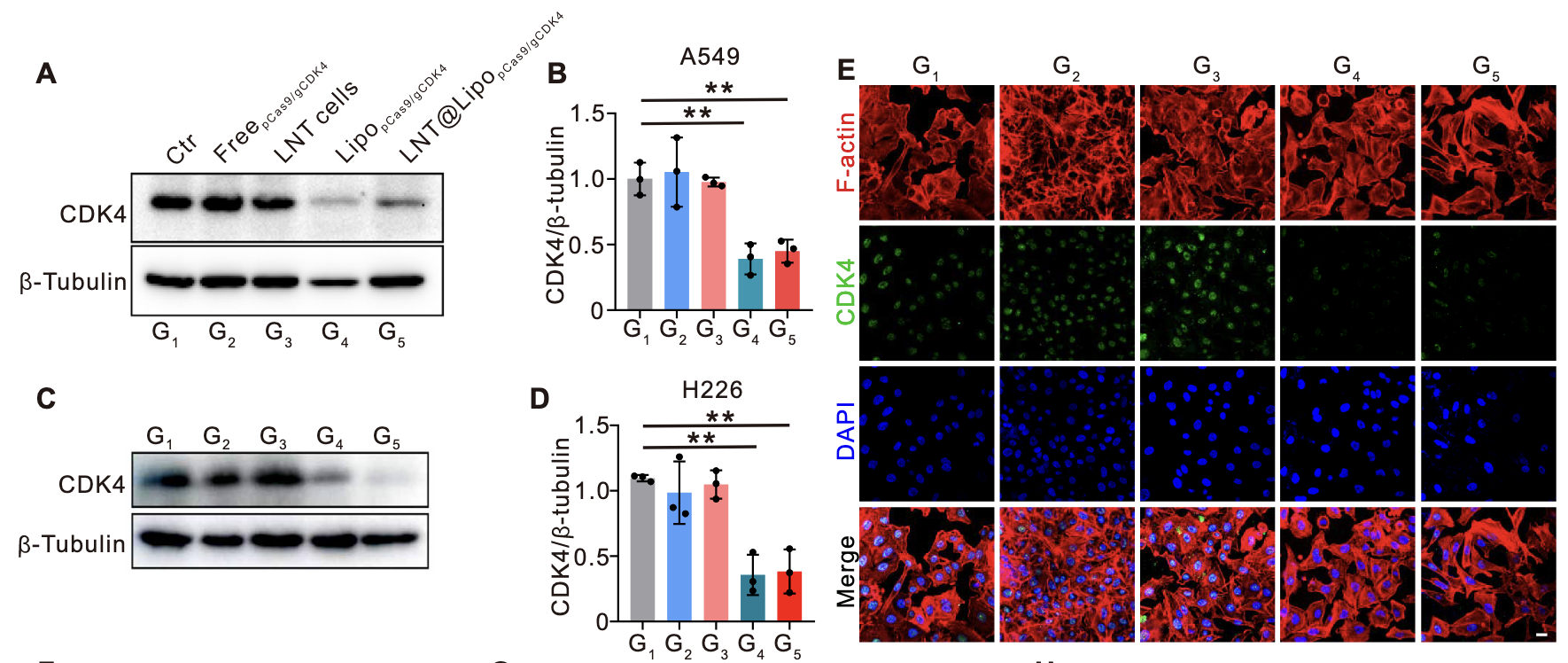 免疫荧光验证:对LNT@LipopCas9/gCDK4处理后的A549细胞进行CDK4免疫荧光染色,共聚焦显微镜观察显示,处理组细胞的CDK4特异性荧光强度显著弱于对照组,进一步从细胞水平证实了CDK4敲除的有效性(图3E、F)。