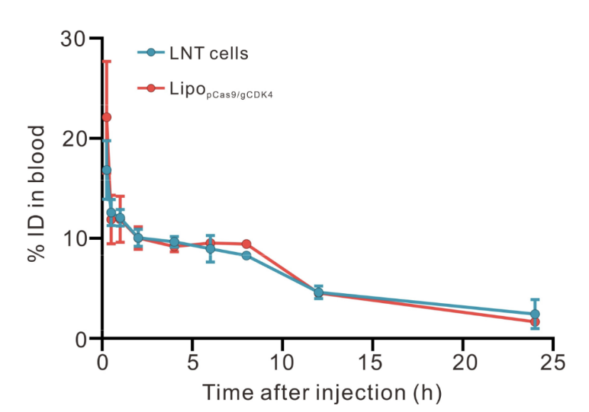 药代动力学特征:通过尾静脉注射LNT@LipopCas9/gCDK4复合物,动态监测LNT细胞(荧光标记)与LipopCas9/gCDK4纳米粒(荧光标记)的体内清除曲线。结果显示,两组药代动力学曲线趋势高度一致,表明LNT细胞与锚定的纳米粒在体内的循环和清除都是同步进行的,进一步证实两者间相互作用的稳定性(图S7)。