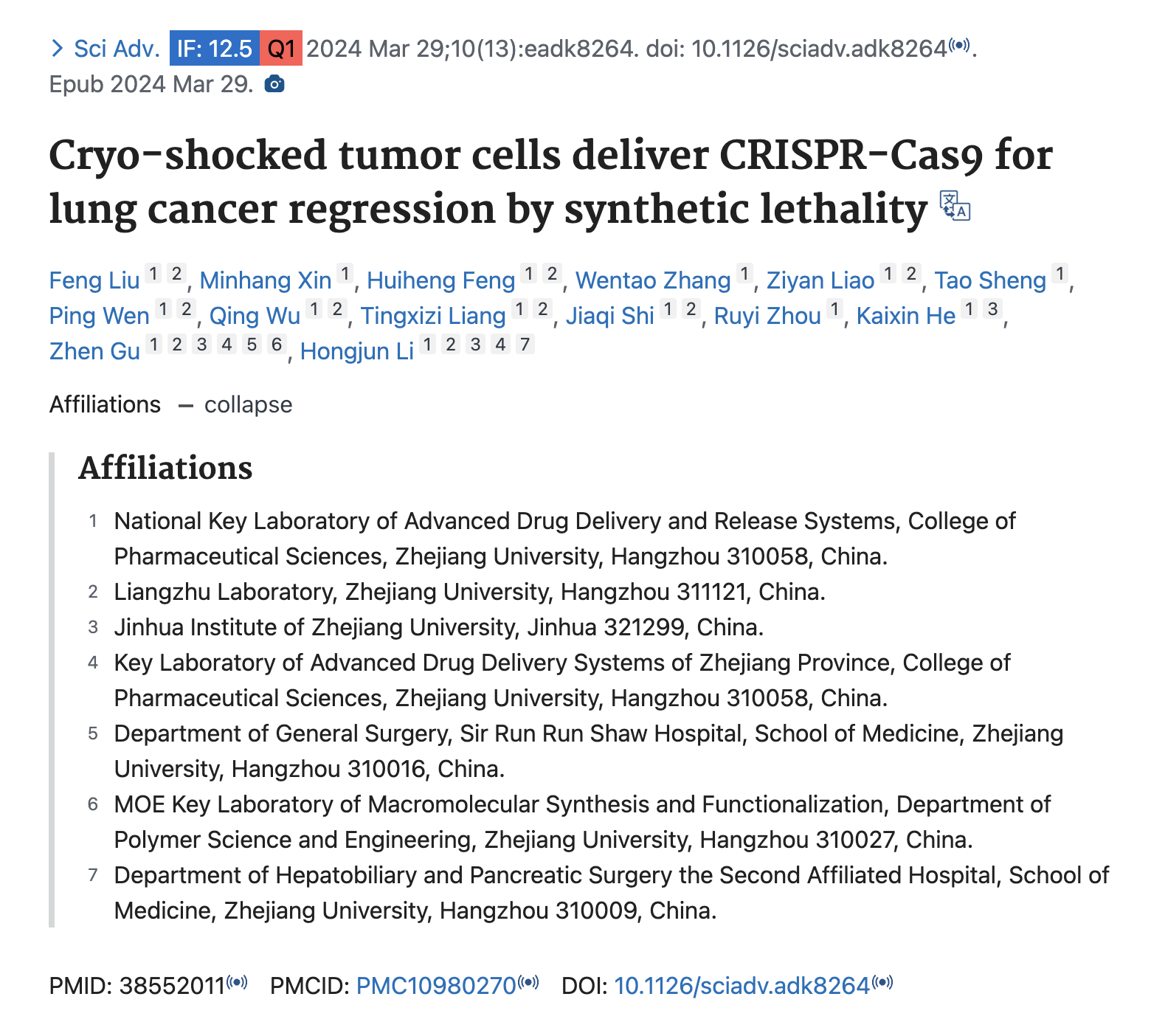 中文题目:冷冻休克的肿瘤细胞通过合成致死性递送CRISPR-Cas9以实现肺癌消退